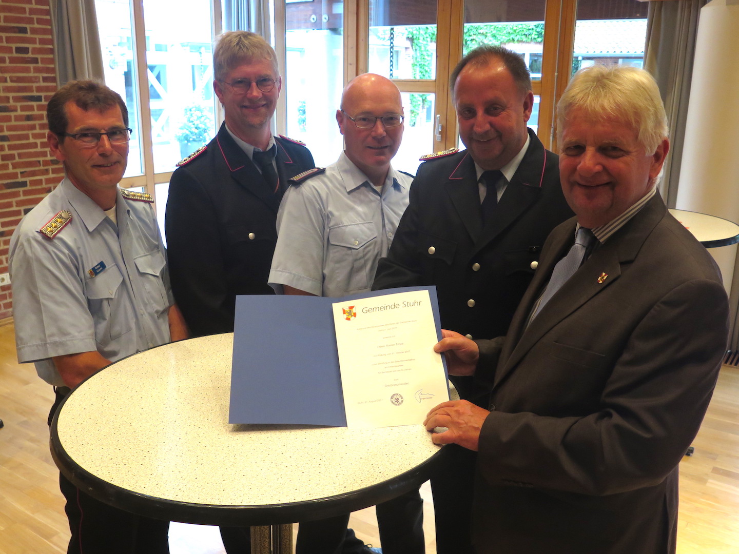 (ct) Am 01.08.2017 wurde im Rahmen einer offiziellen Feierstunde im großen Saal des Stuhrer Rathauses die Leitung der Ortsfeuerwehr Stuhr neu eingesetzt. Im Beisein des Gemeindekommandos, Mitarbeitern der Verwaltung und Mitgliedern des Gemeinderates überreicht Bürgermeister Niels Thomsen die Ernennungsurkunden. Er folgt damit einem Ratsbeschluss, der wiederum der Wahl im Rahmen der bereits Anfang Februar statt gefundenen Jahreshauptversammlung der Ortsfeuerwehr Stuhr folgte. Hier wurde Rainer Troue als Ortsbrandmeister wiedergewählt. Für den 57 jährigen ist es bereits die zweite Amtszeit als Ortsbrandmeister, der zuvor bereits 14 Jahre lang Stellvertreter war.