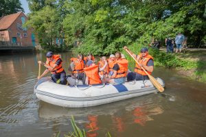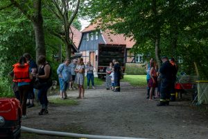 Das Angebot richtete sich vor allem an Kinder, die an verschiedenen Stationen spielerisch den Umgang mit Feuerwehrtechnik erleben konnten. So konnten kleine Besucherinnen und Besucher im Einsatzfahrzeug Platz nehmen, mit dem Strahlrohr hölzerne Flammen umschießen oder durch ein aufgestelltes Hydroschild laufen. Auf dem Mühlenteich sorgte zudem eine Fahrt mit dem Ruderboot für Spaß und Abwechslung.