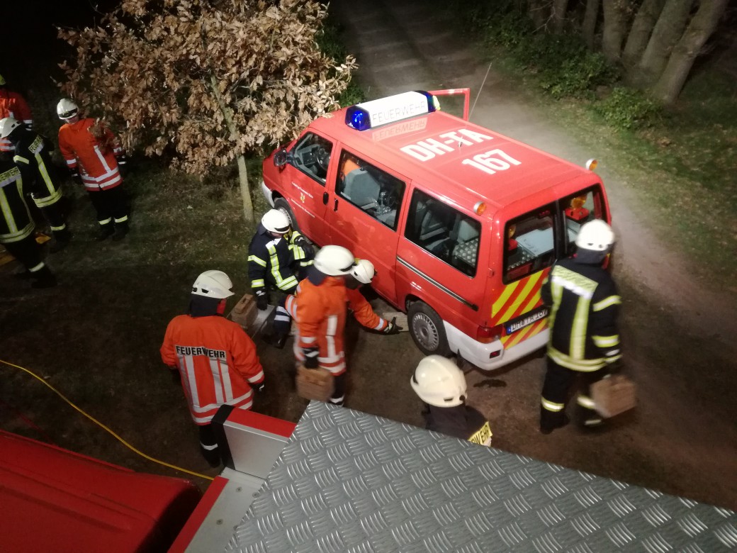 Nachdem die Groß Mackenstedter im Feuerwehrhaus Heiligenrode zunächst anhand einer Präsentation, ihr generelles Vorgehen an der Einsatzstelle erläuterten, rückten die 27 Kameradinnen und Kameraden aus. Die „Alarmierung“ lautete: „VU mit eingeklemmter Person, Kätinger Mühlenweg Ecke Weideweg“. An der Einsatzstelle gab es dann folgendes Szenario: Ein Kleinbus, dargestellt durch einen KdoW (Kommandowagen) der Feuerwehr, war gegen einen Baum gefahren. Auf dem Fahrersitz befand sich eine eingeklemmte Person. Nachdem die Einsatzstelle durch die Heiligenroder zunächst abgesichert und ausgeleuchtet wurde, baute die Groß Mackenstedter HLF-Besatzung ihr Gerät auf, um die Rettung der Person vornehmen zu können. Die Heiligenroder wurden dann von den erfahrenen Kameraden aus Groß Mackenstedt, bei der Rettung der Person angeleitet. Außerdem wurden die Geräte des HLF, zu dem auch hydraulische Werkzeuge, wie Schere und Spreizer gehören, ausgiebig erklärt. Trotz Dunkelheit und Kälte, sind sich die Heiligenroder einig, einen sehr interessanten Übungsdienst erlebt zu haben. Selbst Kameraden, die zuvor schon in technischer Hilfe ausgebildet waren, konnten noch das Eine oder Andere dazulernen oder vertiefen.