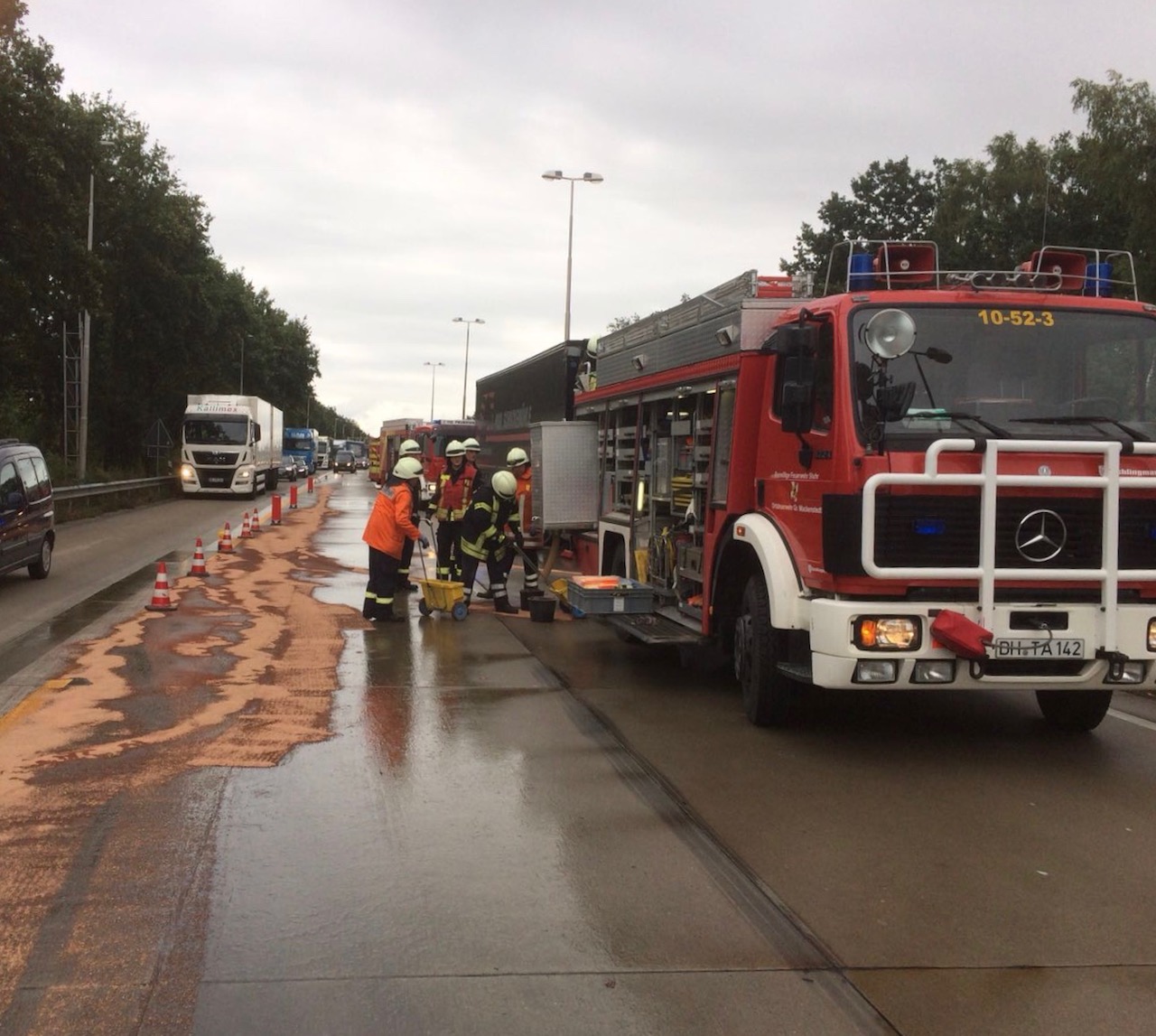Gr.Mackenstedt-(cm). Um 10:20 Uhr wurde die Feuerwehr Groß Mackenstedt, die in Syke stationierte Gefahrgutstaffel-Nord sowie der Einsatzleitwagen aus Fahrenhorst zu einem Verkehrsunfall auf die Bundesautobahn 1 gerufen. Zwischen dem Autobahndreieck Stuhr und der Anschlussstelle Groß Ippener, in Höhe des Parkplatzes „Cordes“, hatte ein LKW die Mittelleitplanke gerammt und sich dabei den Dieseltank aufgerissen. Die Kräfte der Feuerwehr sperrten den Bereich ab und verhinderten eine weitere Ausbreitung mit Ölbindemittel. Die Gefahrgutstaffel pumpte zirka 500 Liter Dieselkraftstoff aus den beschädigten Tank des LKW in ein Behältnis um. Der LKW-Fahrer musste vom Rettungsdienst versorgt werden und aufgrund einer Verletzung an der Wirbelsäule mit dem Rettungshubschrauber „Christoph 6“ in ein nahegelegenes Krankenhaus geflogen werden. Der Feuerwehreinsatz konnte um 13:00 Uhr beendet werden.