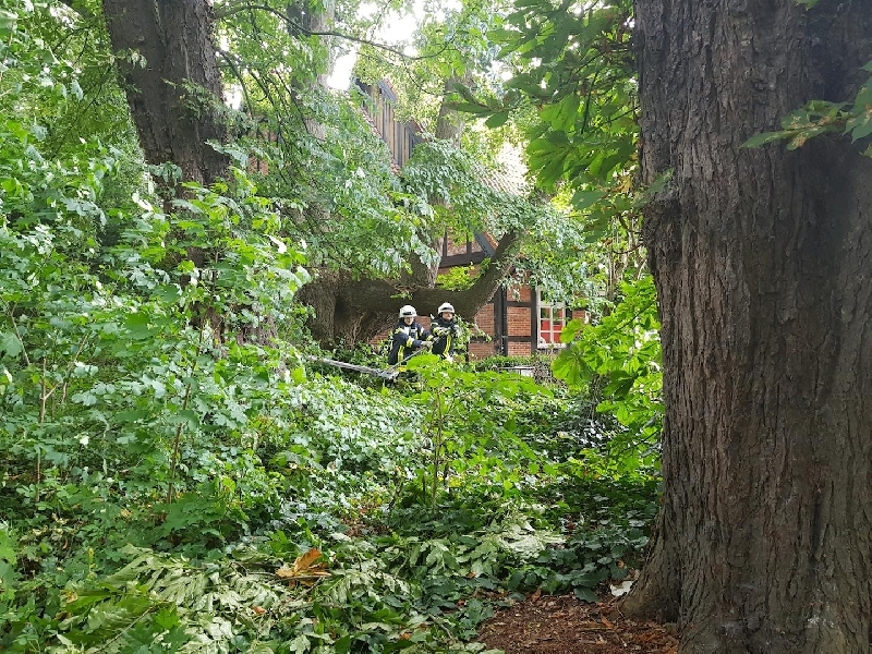 (ct) Um 15:18 Uhr piepten dann erneut die Meldeempfänger. In der Straße „An der Graft“ auf dem Hof des Gut Varrel war dicker Ast aus der Krone eines Baumes abgeknickt und drohte auf den Platz herabzustürzen. Um zu verhindern, dass der Ast unkontrolliert herabstürzt, wurde er mittels Greifzug aus der Krone herausgezogen und dann mit einer Säge zerteilt. Dieser Einsatz konnte nach ca. 1,5 Stunden beendet werden.
