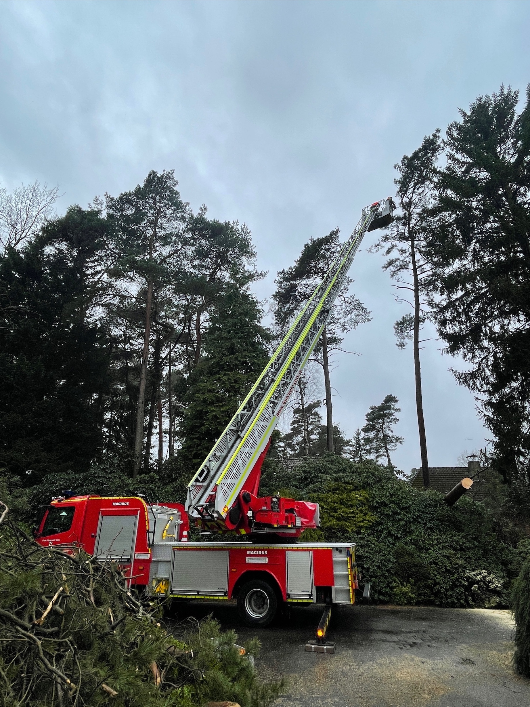 Fahrenhorst – (nc) Auch am Sonntag halten die Auswirkungen des Sturmtiefs Zeynep die Feuerwehr auf Trapp. Es ist kaum Erholung für die Einsatzkräfte möglich und bereits für heute Nacht steht Antonia vor der Tür. So musste die Ortsfeuerwehr Fahrenhorst zusammen mit der Drehleiter aus Brinkum eine Baum im Hasenkamp soweit herunter schneiden bis von ihm keine Gefahr mehr ausging. Der Baum wurde nämlich Freitagnacht von einem umgestürzten Baum so getroffen das er etwas entwurzelt wurde. Nun drohte auch die ca. 18m hohe Fichte auf das Haus zu fallen und weitere Beschädigungen zu verursachen.