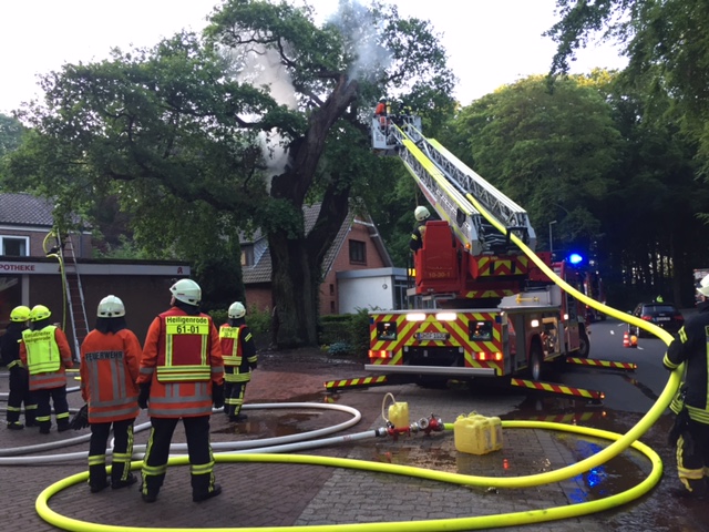 Heiligenrode – (cm). Um 4:35 wurde die Feuerwehr Heiligenrode zu einem Brandeinsatz auf die Heiligenroder Straße alarmiert. In Höhe der dortigen Apotheke, brannte eine 12 Meter hohe alte Eiche, welche von innen hohl war. Bei Eintreffen der ersten Kräfte, schlugen die Flammen bereits mehrere meter hoch aus dem Baum heraus. Im ersten Angriff wurden zwei Trupps zur Brandbekämpfung eingesetzt und eine Wasserversorgung aufgebaut. Anschließend forderte Einsatzleiter Sven Lüßen die Brinkumer Drehleiter an. Im weiteren Verlauf wurden dann teile des Baumes von oben über die Drehleiter abgetragen und die Brandnester abgelöscht. Die Feuerwehren aus Heiligenrode und Brinkum waren mit insgesamt 29 Kameraden vor Ort. Der Einsatz konnte nach zirka 3 Stunden beendet werden. Die Heiligenroder Straße musste für die Löscharbeiten einseitig gesperrt werden.
