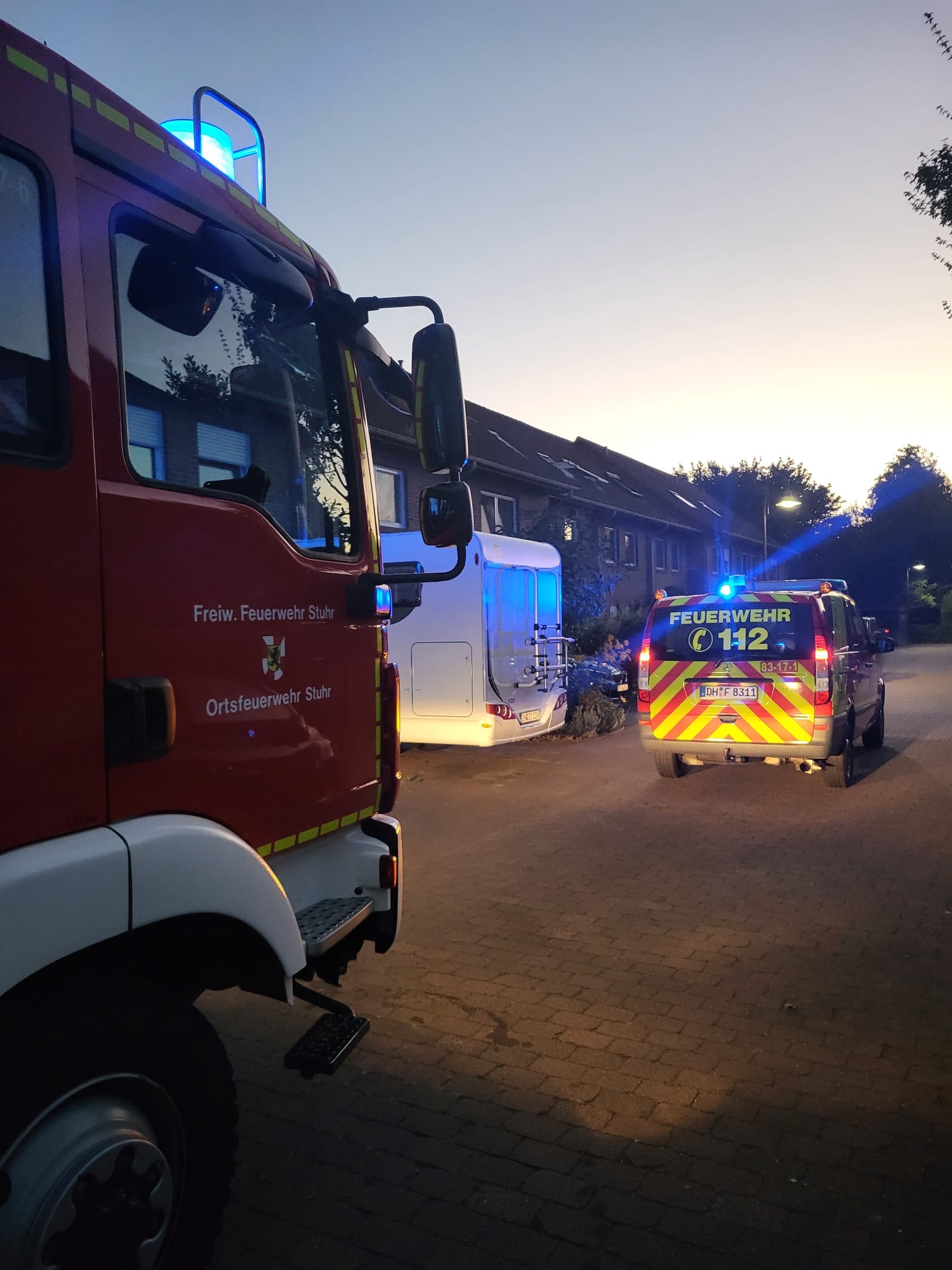 (ct) Am Sonntagabend um 21:16 Uhr ist die Feuerwehr Stuhr mit dem Stichwort „Brennt Gasgrill“ über Meldeempfänger alarmiert worden. Einsatzort war ein Reihenhaus in der Otto-Dix-Straße im Ortsteil Moordeich. Beim Eintreffen der Feuerwehr war das Feuer bereits aus. Die Anwohner berichteten davon, dass es bei der Verwendung des Grills zu einer 2m hohen Stichflamme gekommen sei. Im Anschluss wurde genau richtig gehandelt: die Gaszufuhr der Flasche wurde abgedreht, und zum Löschen des Feuers kam ein Pulverlöscher zum Einsatz. Durch die Feuerwehr wurde nach Eintreffen der Grill mittels Kübelspitze weiter herunter gekühlt und mit einer Wärmebildkamera kontrolliert. Zwei Bewohner wurden vor Ort vom Rettungsdienst untersucht, da sie Rauchgas eingeatmet hatten. Der Einsatz der Feuerwehr konnte nach einer guten halben Stunde beendet werden.