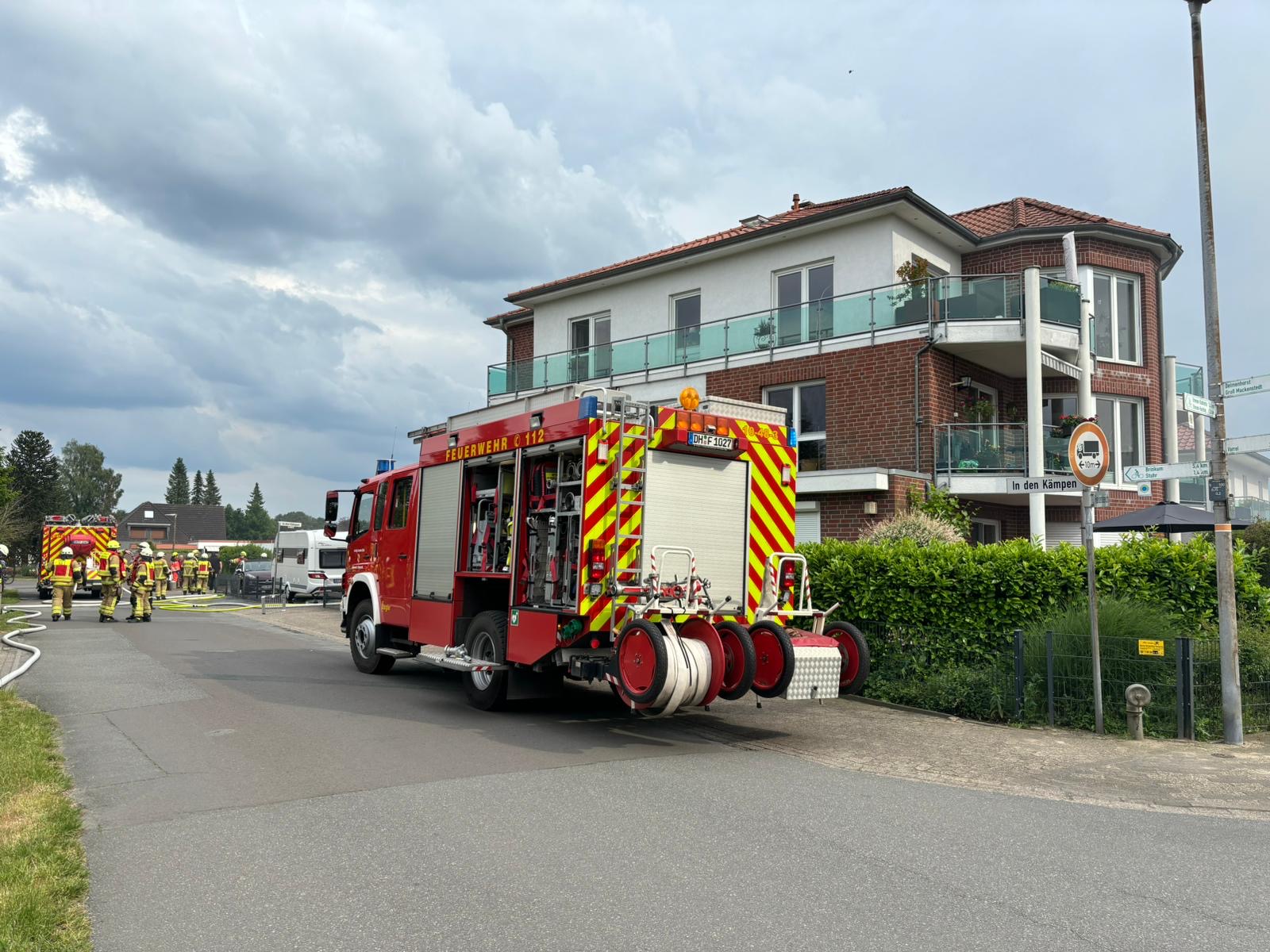 (ct) Am Freitagnachmittag um 16:55 Uhr wurden die Feuerwehren Stuhr und Groß Mackenstedt, die Drehleiter aus Brinkum sowie der Einsatzleitwagen aus Fahrenhorst mit dem Stichwort „Carportbrand an Mehrfamilienhaus“ alarmiert. Einsatzort war ein Garagenhof an der Straße „In den Kämpen“ im Ortsteil Moordeich.