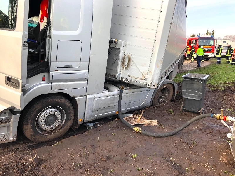 Seckenhausen-(hb). Am 28.2.2020 um 14:47 Uhr wurde die Ortsfeuerwehr Seckenhausen über Meldeempfänger mit dem Stichwort G1, LKW in Wegeseitenraum, läuft vermutlich Diesel aus alarmiert! Beim Eintreffen an der Einsatzstelle in der Straße ,,Handelshof’‘ stellte sich heraus das ein vollbeladener LKW mit Sattelauflieger beim Versuch zu wenden im Wegeseitenraum steckengeblieben ist! Der Dieseltank wurde beschädigt und auslaufender Dieselkraftstoff von der Feuerwehr aufgefangen! Die hinzu alarmierte Gefahrgutstaffel Nord aus Syke pumpte den restlichen Tankinhalt um so das dann ein Bergungsunternehmen mit Kran mit dem Bergen des LKW beginnen konnte! Der Einsatz für die Feuerwehr war nach ca. 2 Stunden beendet!