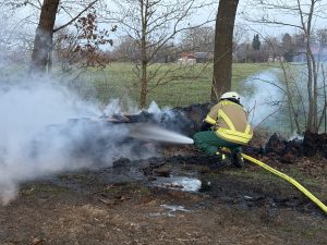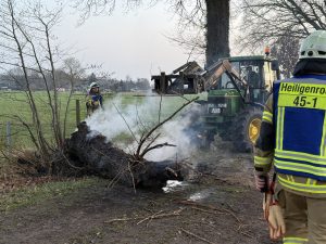 (nt) Am frühen Abend des 08. März 2026 wurde die Feuerwehr Heiligenrode zu einem brennenden Baumstumpf an einem Feldweg an der Neukruger Straße alarmiert. Anwohnende haben gegen 17:30 Uhr einen lauten Knall gehört, wenig später den Brand am ca. 3m hohen, hohlen Baumstamm entdeckt und die Feuerwehr alarmiert.
