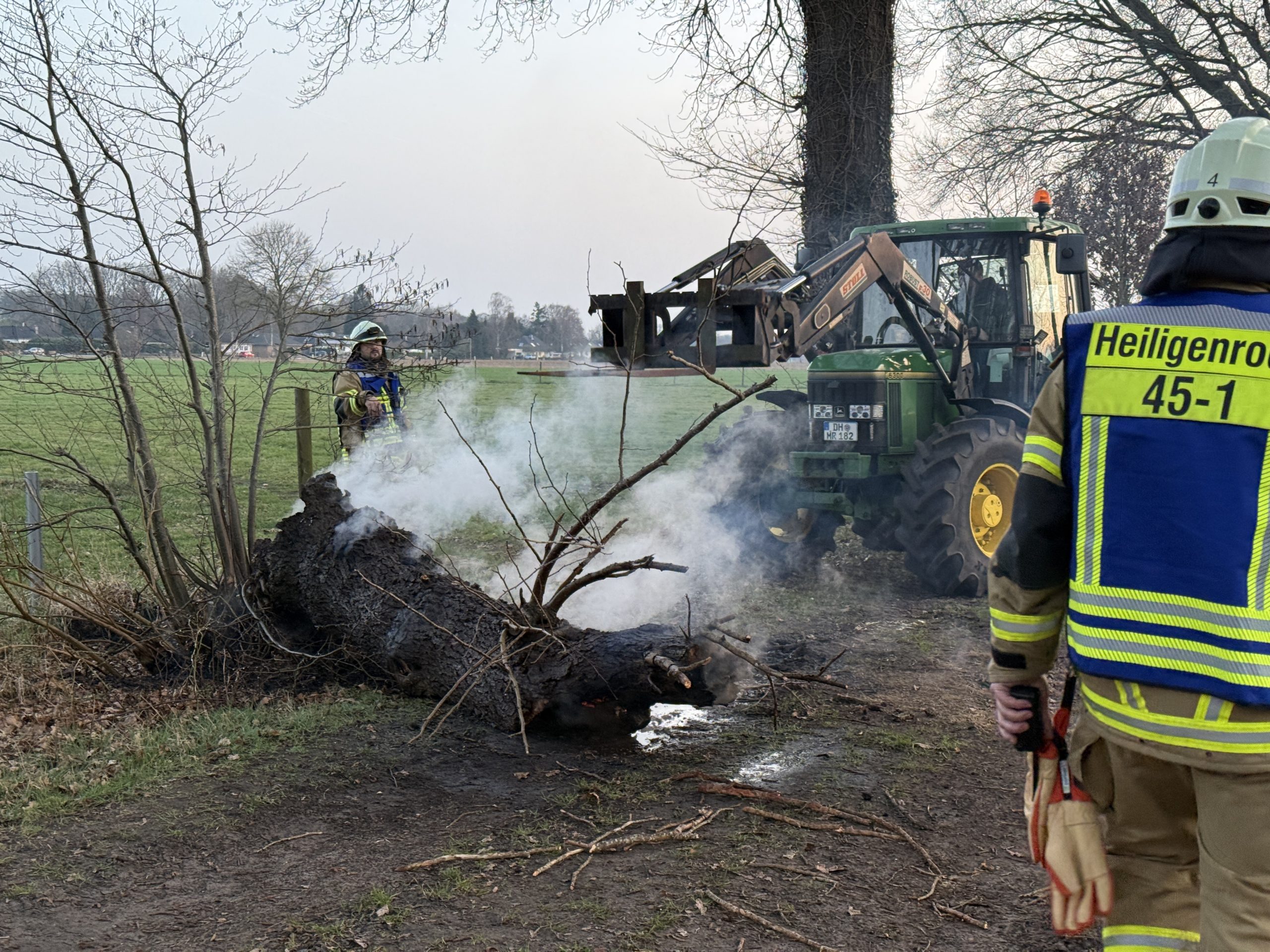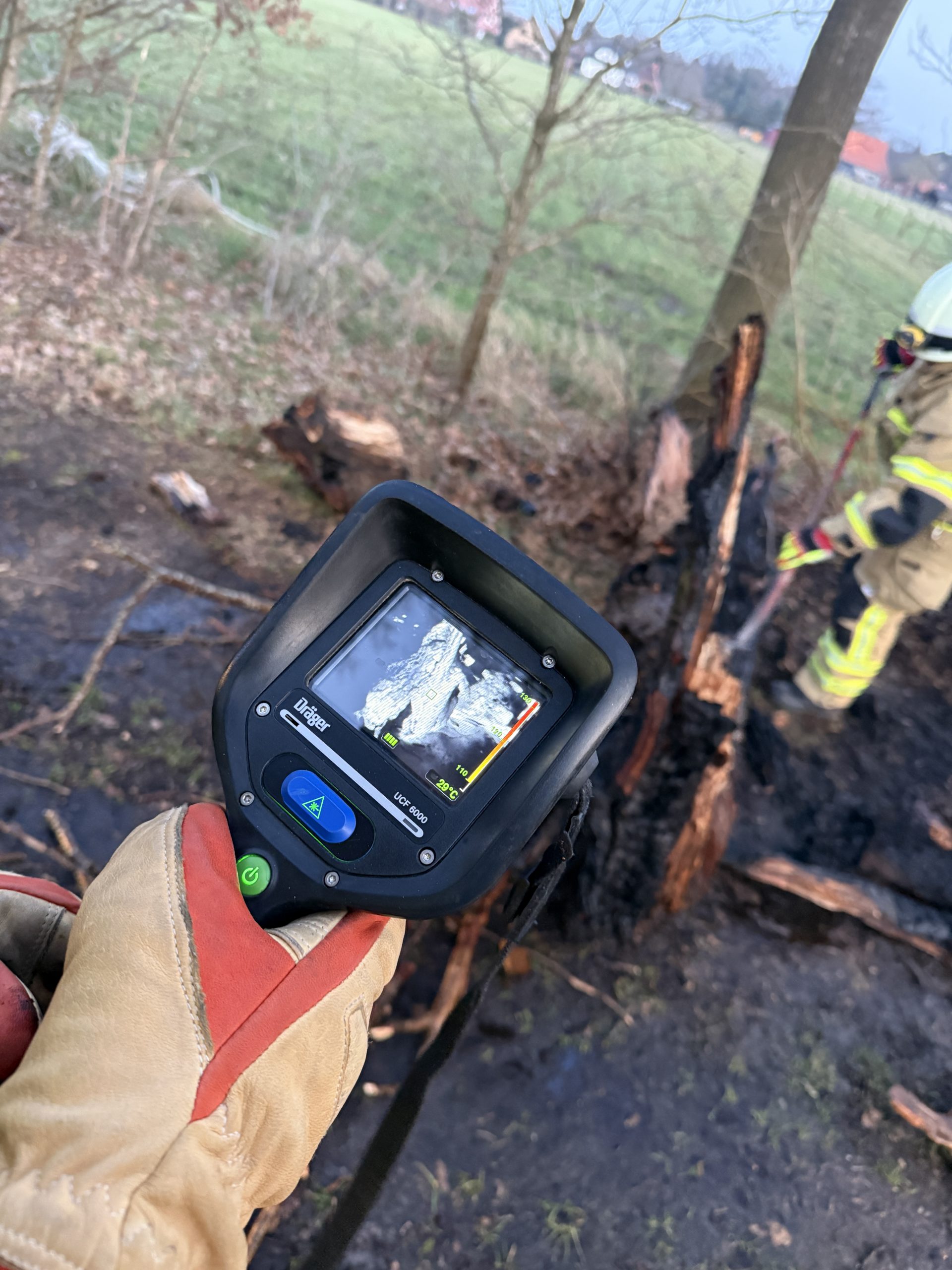 Der Stamm wirde mit einer Kettensäge zu Fall gebracht und anschließend in kleine Stücke zerteilt, um die innenliegenden Glutnester ablöschen zu können. Mit einer Wärmebildkamera wurden alle Teile noch auf Hitzequellen überprüft, bevor der Einsatz nach etwa einer Stunde wieder beendet werden konnte.