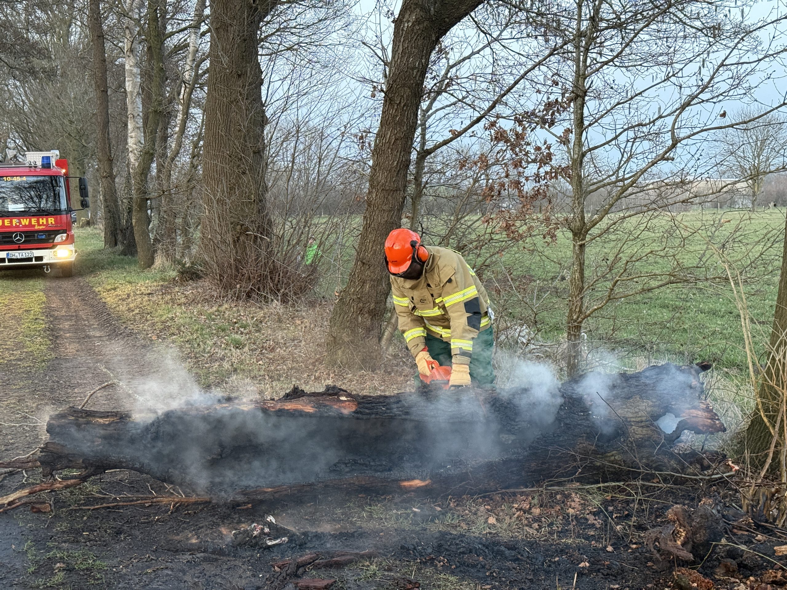(nt) Am frühen Abend des 08. März 2026 wurde die Feuerwehr Heiligenrode zu einem brennenden Baumstumpf an einem Feldweg an der Neukruger Straße alarmiert. Anwohnende haben gegen 17:30 Uhr einen lauten Knall gehört, wenig später den Brand am ca. 3m hohen, hohlen Baumstamm entdeckt und die Feuerwehr alarmiert.