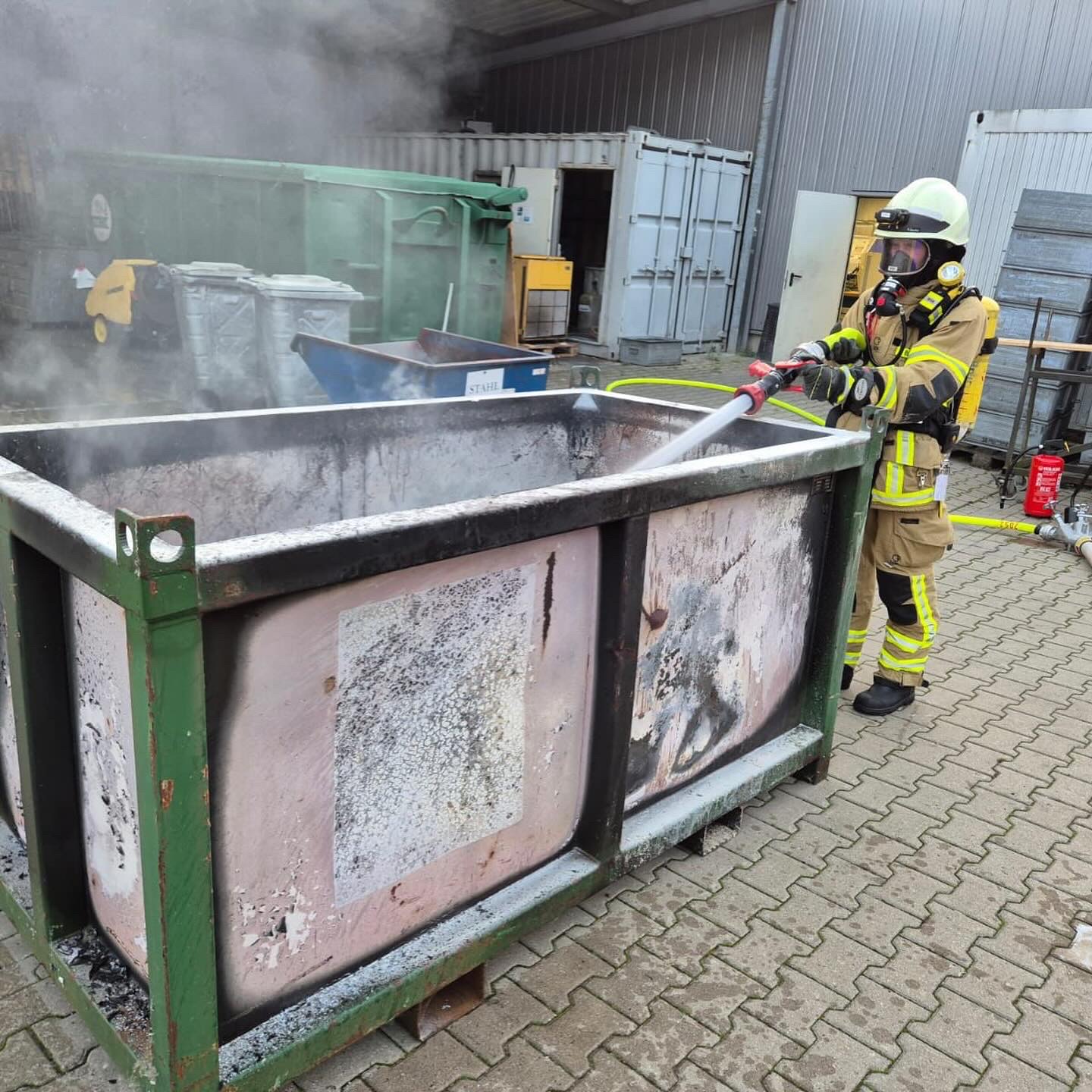 Beim Eintreffen der Feuerwehr hatten Mitarbeiter der Firma den Container, der unter einem Vordach stand, bereits ins Freie gefahren und erste Löschmaßnahmen durchgeführt. Hier kamen mehrere Feuerlöscher zum Einsatz. Somit mussten durch die Feuerwehr nur noch Nachlöscharbeiten durchgeführt werden. Da in dem Container Metallspäne brannten, kam hierzu auch ein Metallbrandfeuerlöscher zum Einsatz. Im Anschluss wurde der Container noch mit Wasser geflutet.