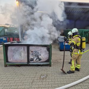 Beim Eintreffen der Feuerwehr hatten Mitarbeiter der Firma den Container, der unter einem Vordach stand, bereits ins Freie gefahren und erste Löschmaßnahmen durchgeführt. Hier kamen mehrere Feuerlöscher zum Einsatz. Somit mussten durch die Feuerwehr nur noch Nachlöscharbeiten durchgeführt werden. Da in dem Container Metallspäne brannten, kam hierzu auch ein Metallbrandfeuerlöscher zum Einsatz. Im Anschluss wurde der Container noch mit Wasser geflutet.