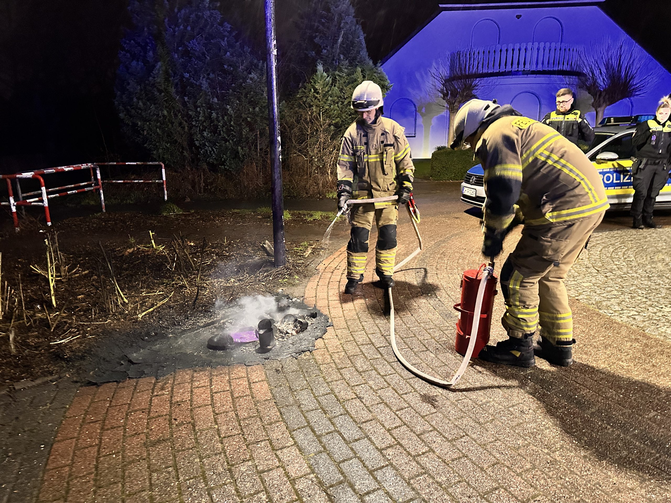 (ct) Heute Morgen um 07:25 Uhr wurde die Feuerwehr Stuhr mit dem Stichwort „Mülltonnenbrand“ alarmiert. Einsatzort war der Wendekreis der Beethovenstraße im Ortsteil Moordeich. Auf einer Freifläche vor dem Bahnübergang brannten beim Eintreffen die Überreste einer Wertstofftonne. Diese wurden mithilfe einer Kübelspritze abgelöst. Der Einsatz konnte schnell beendet werden.