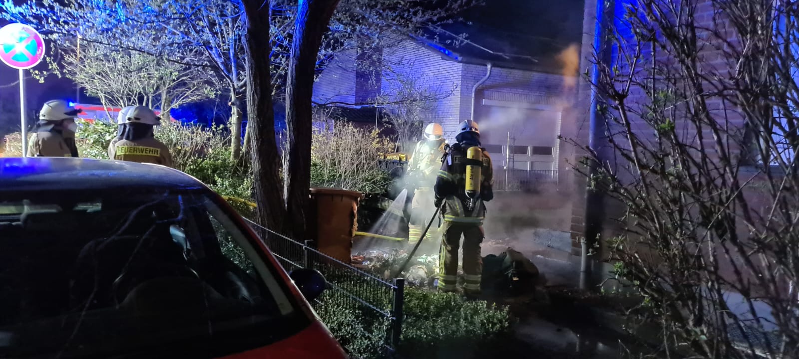 Brinkum(nk). Am frühen Samstagmorgen, um 03:10 Uhr, wurden die Feuerwehr Brinkum sowie der Rettungsdienst zu einem Brandeinsatz in die Werrastraße gerufen. Hier sollte es nach Meldung der Leitstelle zu einem Mülltonnenbrand gekommen sein. Beim Eintreffen der ersten Kräfte konnte festgestellt werden, dass an einem Wohnhaus zwei größere Mülltonnen in Vollbrand standen. Daraufhin wurde das Feuer durch einen Trupp unter Umluftunabhängigem Atemschutz mittels einem C-Rohr abgelöscht. Da es durch die Wärmestrahlung zu einem Schaden am Gebäude kam, wurde die angrenzende Wohnung durch die Einsatzkräfte kontrolliert. Nach gut 30 Minuten konnte der Einsatz wieder beendet werden.