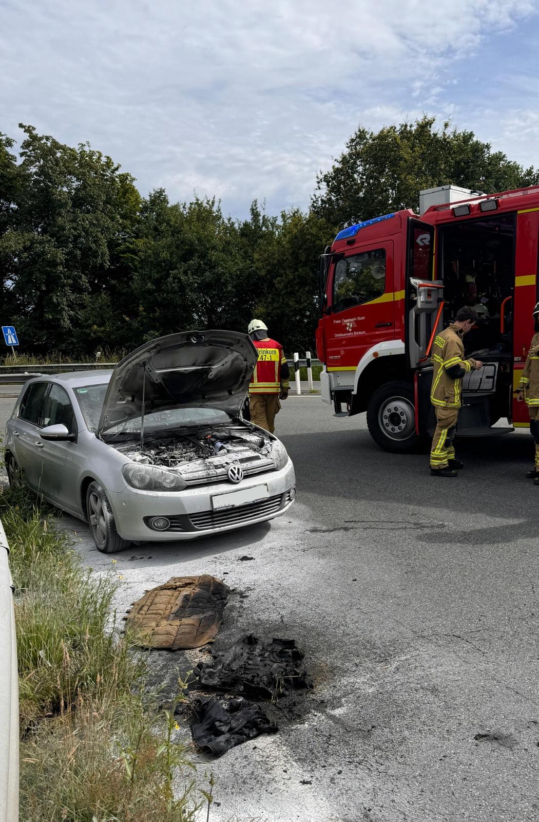 Brinkum-(cm). Die Feuerwehr Brinkum und der Rettungsdienst wurden am Donnerstagnachmittag um 15:56 Uhr zu einem Brandeinsatz auf die B6 gerufen. In der Autobahnabfahrt Brinkum, war ein PKW im Motorbereich in Brand geraten. Bei Eintreffen der Kräfte, war das Feuer bereits durch anwesende Bauarbeiter, mit Hilfe eines Pulverlöschers abgelöscht worden. Die Feuerwehr führte Nachlöscharbeiten mit einem Kleinlöschgerät durch und kontrollierten das Fahrzeug mit der Wärmebildkamera. Im Anschluss wurde der PKW aus dem Gefahrenbereich geschoben. Nach einer Stunde war der Einsatz abgearbeitet.