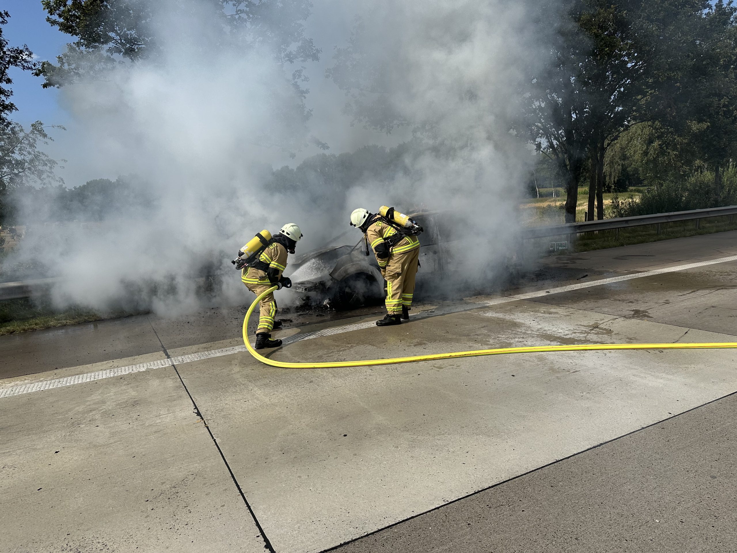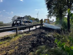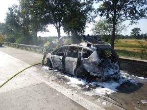 Stuhr – (ps). Die Feuerwehr Groß Mackenstedt und der Rettungsdienst wurden am Freitagnachmittag um 15:29 Uhr zu einem Brandeinsatz auf die Bundesautobahn 1 zwischen dem AD Stuhr und der AS Gr. Ippener gerufen. Auf der der Autobahn 1 in Fahrtrichtung Osnabrück, war ein PKW in Brand geraten. Bei Eintreffen der Kräfte stand das Fahrzeug in Vollbrand. Die Feuerwehr setzte ein Atemschutztrupps zur Brandbekämpfung ein. Die Familie die mit dem Fahrzeug unterwegs war wurde vorsorglich vom Rettungsdienst versorgt. Die Kräfte der Feuerwehr stoppten zusätzlich eine Ausbreitung von auslaufenden Kraftstoff mit Bindemittel. Nach 75 Minuten war der Einsatz abgearbeitet. Die Autobahn 1 musste für die Lösch-und Bergungsarbeiten voll gesperrt werden.