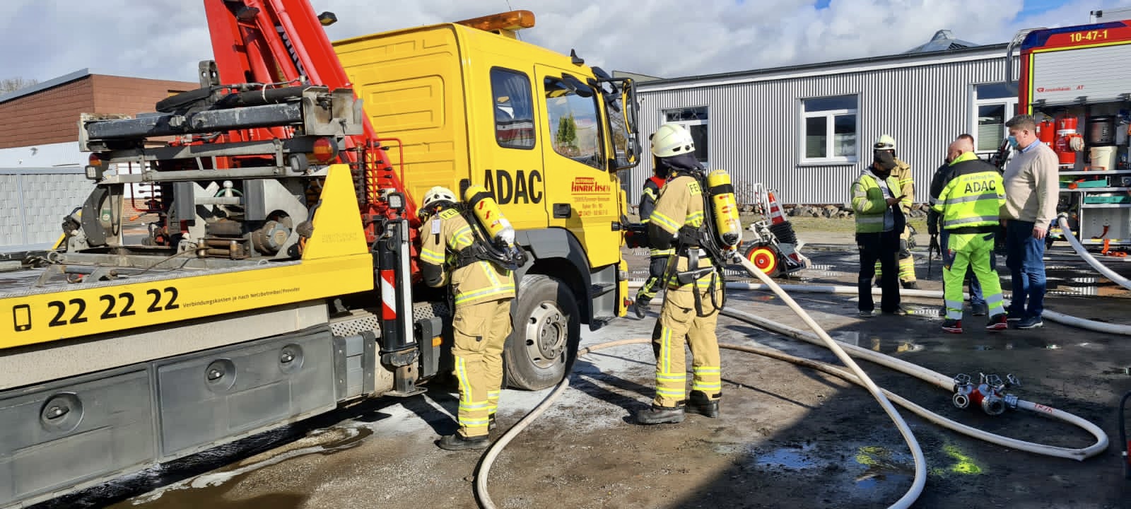 Brinkum-(cm). Feuerwehr Brinkum und der Rettungsdienst wurden am Sonntagnachmittag um 15:20 Uhr zu einem Brandeinsatz nach Brinkum gerufen. Auf dem Gelände eines Autohauses in der Syker Straße, war ein Abschleppwagen im Motorbereich in Brand geraten. Bei Eintreffen hatten Mitarbeiter den Brand bereits mit Hilfe eines Feuerlöschers unter Kontrolle gebracht. Ein Trupp unter Atemschutz führte Nachlöscharbeiten durch und kontrollierte mit der Wärmebildkamera das Fahrzeug auf weitere Glutnester. Nach einer halben Stunde war der Einsatz abgearbeitet.