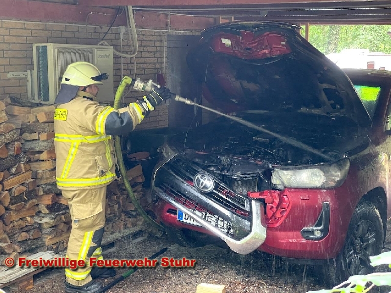 Vor Ort eingetroffen konnte festgestellt werden, dass die Bewohner des Hauses, unterstützt durch Nachbarn, schon erste Löschversuche mit einem Gartenschlauch und einem Feuerlöscher unternommen hatten. Das war erfolgreich und ein Übergreifen auf das Carport konnte dadurch verhindert werden. Die Feuerwehr musste lediglich noch Nachlöscharbeiten durchführen, um den Motorblock weiter runter zu kühlen. Um an diesen heran zu kommen, musste die Motorhaube mit einer Säbelsäge geöffnet werden. Neben dem Löschen wurden auch noch die Batterien des PKW abgeklemmt und ausgebaut. Im Anschluss wurde der Motorraum mit einer Wärmebildkamera kontrolliert.