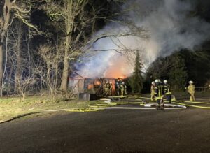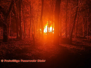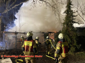 Groß Mackenstedt(nt). Am Donnerstagabend um 20:08 Uhr wurden die Feuerwehren Groß Mackenstedt zusammen mit den Ortsfeuerwehren Stuhr, Heiligenrode, Seckenhausen dem Einsatzleitwagen aus Fahrenhorst sowie der Drehleitereinheit aus Brinkum zu einem Brandeinsatz nach Groß Mackenstedt alarmiert. Laut Meldung der Leitstelle aus Diepholz sollte es in der Straße Zum Steller See in einem kleinen Stallgebäude (etwa 5x10m) zu einem Schadenfeuer gekommen sein. Bei Eintreffen der ersten Einsatzkräfte stand das Fachwerkgebäude bereits im Vollbrand. Um eine Brandausbreitung auf ein danebenstehendes Gebäude zu verhindern wurde direkt ein umfangreicher Löschangriff mit mehreren C-Rohren im Außen- sowie Innenangriff aufgebaut. Im ganzem Verlauf waren etwa 70 Einsatzkräfte an dem Einsatz beteiligt. Hierbei wurden zudem Heuballen aus einem danebenstehenden Strohlager entfernt mit Wärmebildkamera kontrolliert und gegebenenfalls abgelöscht. Nachdem das Feuer im Gebäude gelöscht war, wurden die im Inneren befindlichen Strohballen ins Freie gebracht und dort auseinander gezogen und abgelöscht. Nach gut 4 Stunden konnte Einsatz wieder beendet werden.