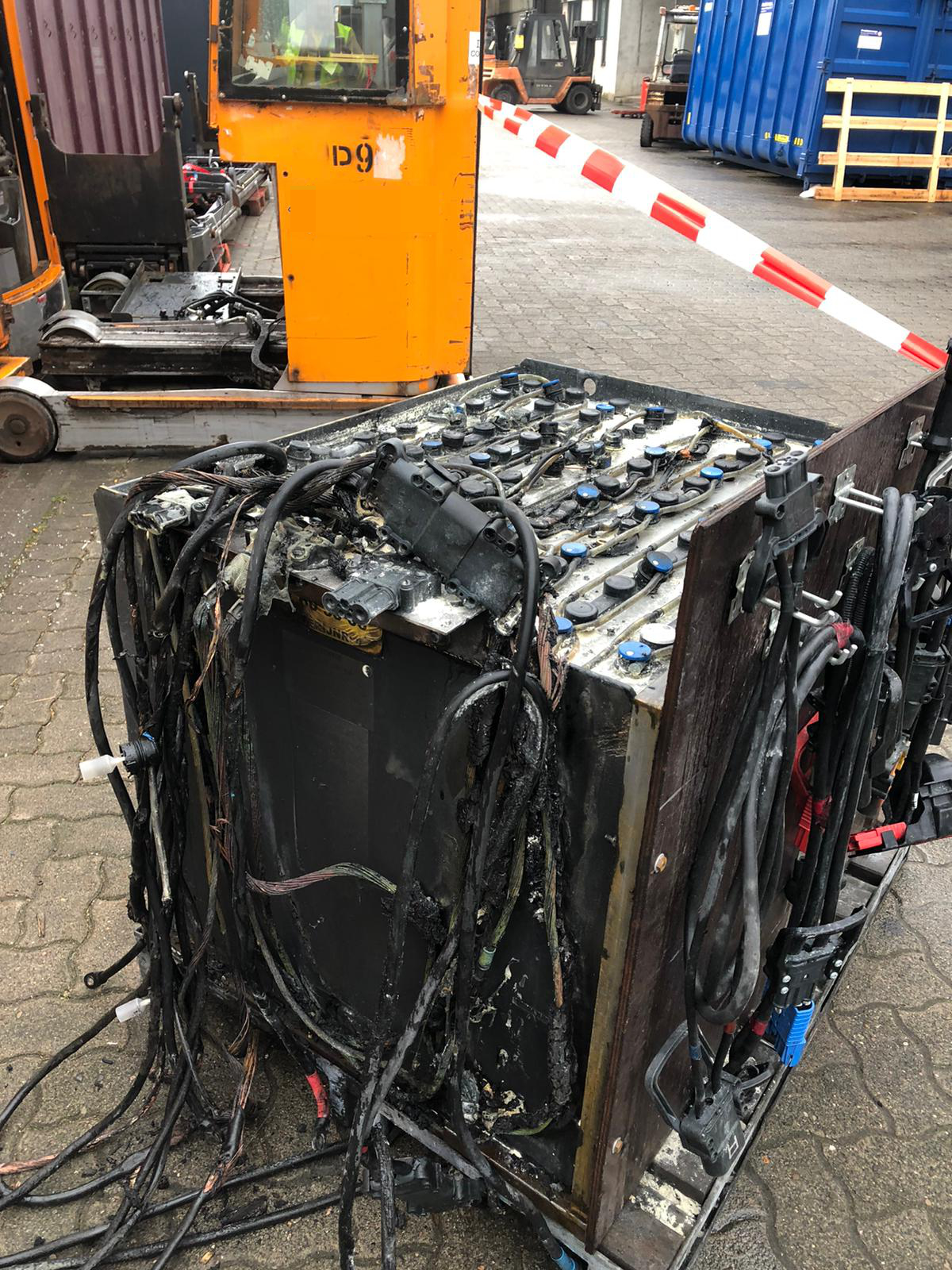 Vor Ort eingetroffen stellte die Lage sich so da, dass eine Batterieanlage für einen Gabelstapler im Bereich des Hauptkabelstrang in einer Halle in Brand geraten war. Der Brand wurde durch Mitarbeiter mit diversen Feuerlöschern eingedämmt und danach ins Freie gebracht. Die Besatzung des Hilfeleistungslöschgruppenfahrzeuges kühlte die noch qualmenden Batterieanlage ab und kontrollierte diese mit einer Wärmebildkamera. Da Kabel auf der Oberseite der Batterieanlage mit einander Verschmolzen waren wurden diese von der Batterie getrennt und somit ging keine Gefahr mehr von der Batterieanlage aus. Ein Mitarbeiter wurde leicht verletzt und wurde vom vorsorglich alarmierten Rettungsdienst behandelt.