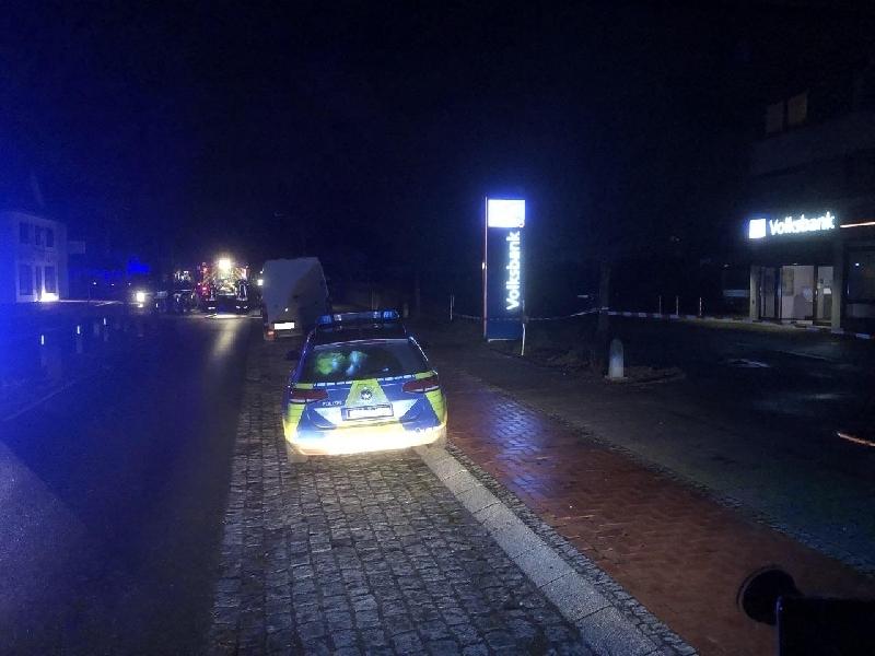 Brinkum (mt) – Die Ortsfeuerwehr Brinkum wurde um 3:30 Uhr durch die Leitstelle alarmiert. In einer Bankfiliale an der Syker Straße hatte es eine Explosion gegeben und es konnte ein nachfolgender Brand nicht ausgeschlossen werden. Die eintreffenden Kräfte der Feuerwehr konnten kein Feuer feststellen. Im Vorraum der Bank, in dem sich auch der Geldautomat befindet, wurde allerdings eine Apparatur mit Gasflaschen festgestellt. Da unklar war, ob aus den Flaschen noch Gas ausströmt und es ggf. zu einer weiteren Explosion kommen kann, wurde die Messgruppe Nord der Kreisfeuerwehr nachalarmiert. Die Kräfte aus Brinkum stellten den Brandschutz sicher und zogen sich ansonsten wieder einige Meter von der Einsatzstelle zurück. Die Polizei evakuierte die Anwohner, das DRK übernahm die Betreuung. Die Spezialkräfte von der Messgruppe, die in Sudweyhe und Barrien stationiert ist, gingen unter Atemschutz mit Messgeräten in die Einsatzstelle. Nach kurzer Zeit konnte Entwarnung gegeben werden. Es strömte kein Gas mehr aus und es bestand an keiner Stelle im Gebäude mehr Explosionsgefahr. Die Einsatzstelle konnte nach ca. einer Stunde an die Polizei zur weiteren Untersuchung übergeben werden. Im Einsatz waren ca. 30 Kräfte der Feuerwehr. Der Fachberater Gefahrgut der Kreisfeuerwehr und der Gemeindebrandmeister Stuhr waren ebenfalls beratend vor Ort.