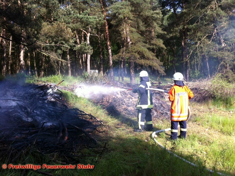 Vor Ort fanden die Einsatzkräfte entzündetes am Boden breit gestapeltes Astwerk und einen großen Laubhaufen vor. Dieses Brandgut konnte mit zwei C-Rohren abgelöscht werden. Zudem wurden die Haufen auseinander gebreitet, um ein Ablöschen der tieferen Schichten zu ermöglichen. Dem Löschwasser wurde Netzmittel beigemischt, um das Eindringen des Löschmittels in das Brandgut zu verbessern. Auf Grund der zur Brandbekämpfung benötigten Löschwassermenge wurde die Ortsfeuerwehr Groß Ippener zur Unterstützung angefordert, denn der Einsatzort befand sich bereits im Oldenburgischen.