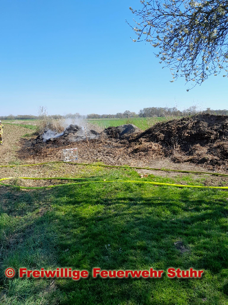 (ct) Heute um 15:43 Uhr wurde die Feuerwehr Stuhr über Meldeempfänger alarmiert. Gemeldet wurde ein Flächenbrand in der Straße Stuhrreihe. Hier hat das Rest eines Osterfeuers auf die nahegelegene Böschung übergegriffen. Die Feuerwehr nam mehrere C-Rohre vor, um den Brand zu löschen. Um auch das Osterfeuer komplett zu löschen, kam der Trecker eines benachbarten Bauern zum Einsatz. Dieser zog das Feuer auseinander, so dass die Feuerwehr es dann ablöschen konnte. Die Wasserversorgung wurde über einen nahe gelegenen Hydranten sichergestellt. Der Einsatz der Feuerwehr konnte nach eineinhalb Stunden beendet werden.