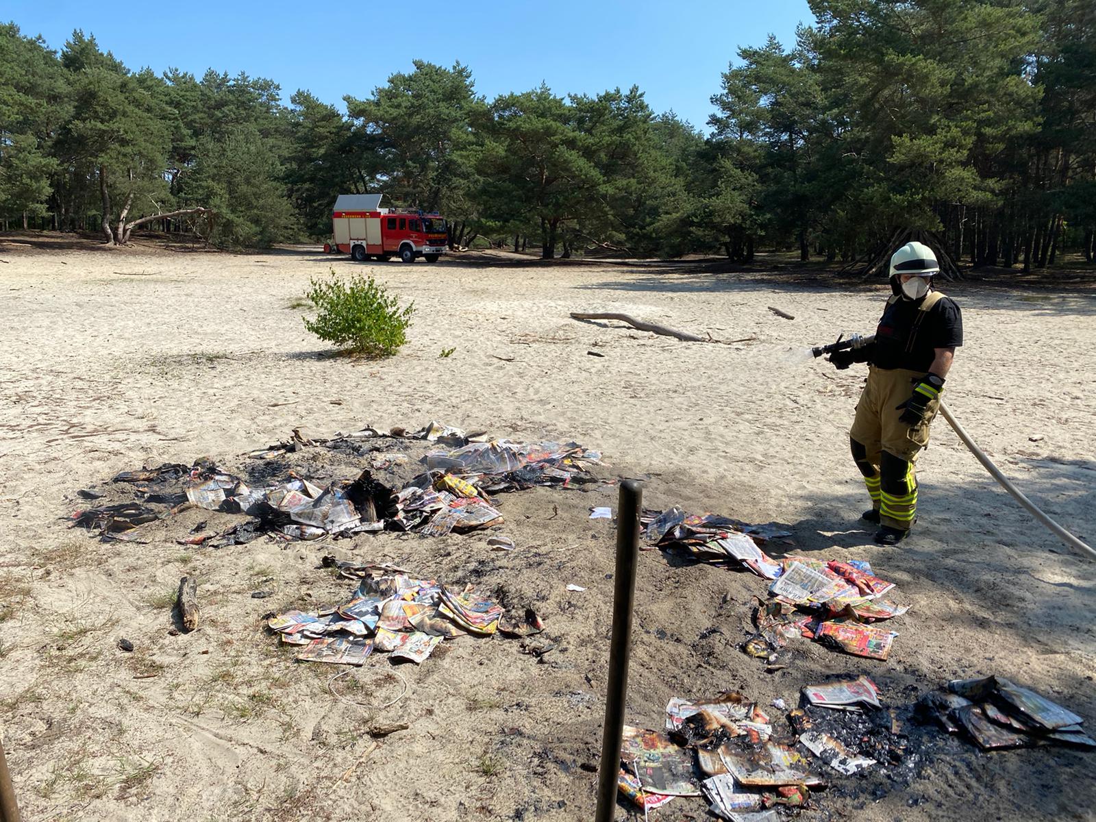 Nach ersten Meldungen sollte ein Kleinfeuer auf einer Freifläche im Wald brennen. Vor Ort eingetroffen konnte festgestellt werden das Bündel aus Zeitung brennen. Durch das beherzte Eingreifen von Ersthelfern die das Feuer weitestgehend eingedämmt hatten, löschte die Feuerwehr die Letzten Flammen und Glutnester ab.