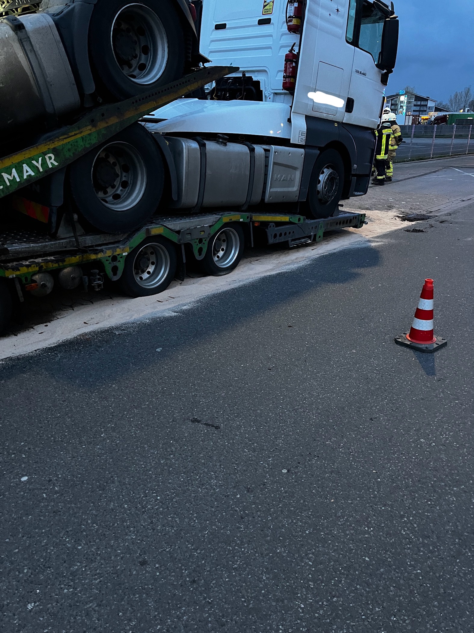 Beim Eintreffen der ersten Einsatzkräfte bestätigte sich die Lage. Der auslaufende Dieselkraftstoff wurde von den Einsatzkräften mit Bindemittel abgestreut, sodass dieser nicht weiter in die Oberflächenentwässerung laufen konnte.