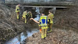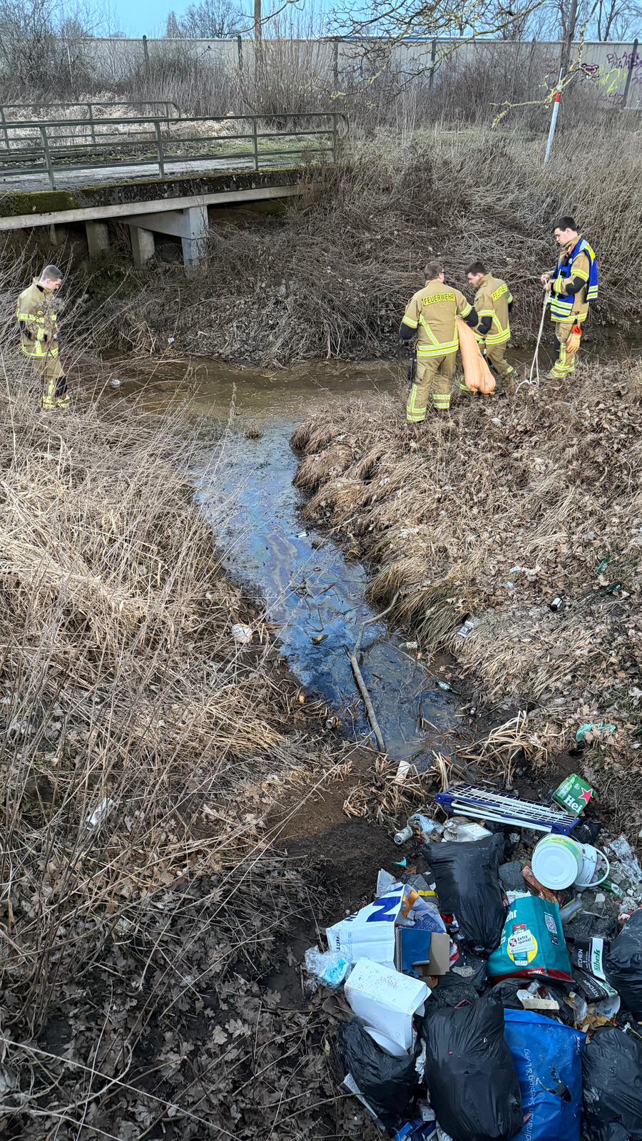 Beim Eintreffen der Einsatzkräfte bestätigte sich die Meldung. Im Bereich des Gewässers wurde eine nicht rechtskonforme Entsorgung festgestellt, aus der Öl in das Wasser gelangte. Um eine weitere Ausbreitung zu verhindern, setzten die Einsatzkräfte eine Ölsperre. Das bereits ausgetretene Öl wurde anschließend mit wassergeeignetem Ölbindemittel abgestreut und aufgenommen.