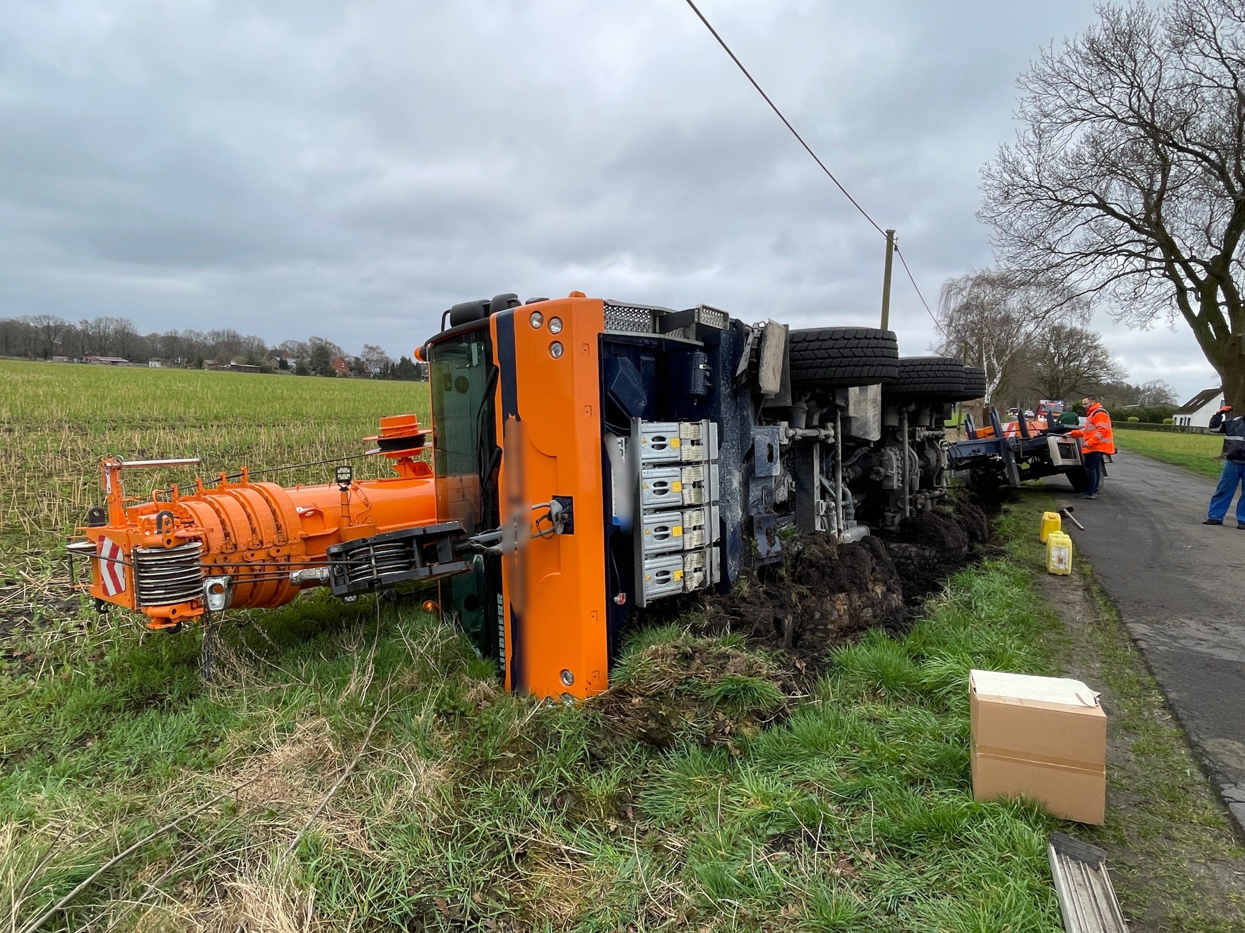Gr. Mackenstedt – (ps) Die Einsatzkräfte der Ortsfeuerwehr Groß Mackenstedt, der Einsatzleitwagen aus Fahrenhorst sowie der Gerätewagen Gefahrstoff aus Syke wurden am Donnerstagmorgen um 8:08 Uhr in die Eggeseer Straße alarmiert. Nach Angaben der Leitstelle sollte hier ein Mobilkran umgekippt sein und Dieselkraftstoff verlieren. Beim Eintreffen der ersten Einsatzkräfte bestätigte sich die Meldung und die Lage wurde erkundet. Es konnten keine auslaufenden Betriebsstoffe festgestellt werden. Der Mobilkran wollte einem entgegenkommenden Fahrzeug ausweichen damit diese aneinander vorbeifahren konnten. Hierbei geriet der Mobilkran in den Seitenraum der Straße, welcher durch die hohe Feuchtigkeit so instabil war, dass der Mobilkran umstürzte. Die Bergung des Mobilkrans wurde durch ein Fachunternehmen durchgeführt und zog sich bis in die Abendstunden hin. Während der Bergungsmaßnahmen blieb die Straße voll gesperrt.