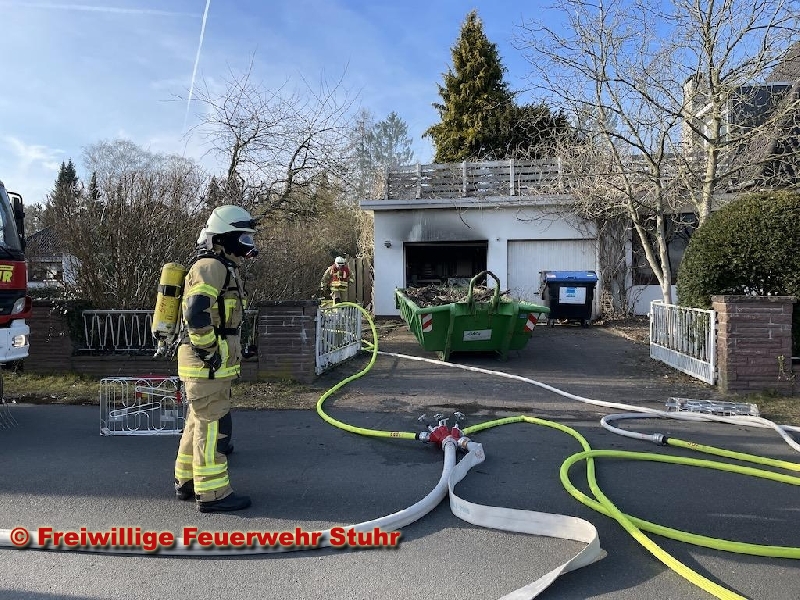 (ct) Am Samstag Nachmittag um 15:37 Uhr wurde die Feuerwehr Heiligenrode über Sirene und Meldeempfänger alarmiert. Gemeldet wurde ein Garagenbrand im Fasanenweg im Ortsteil Neukrug. Beim Eintreffen drangen Qualm und Flammen aus der Garage, sodass sofort die Alarmstufe erhöht und die Feuerwehr Fahrenhorst nachalarmiert wurde. Da keine Person mehr im Gebäude waren, konnte sofort mit der Brandbekämpfung begonnen werden. Hierzu ging einen Trupp unter Umluftunabhängigem Atemschutz mit einem C-Rohr in das Gebäude vor. Das Feuer hatte sich bereits von der Garage auf ein Zwischenbau zum Wohnhaus hin ausgebreitet. Durch den schnellen Löschangriff konnte verhindert werden, dass das Feuer auf das Wohnhaus übergreift. Somit wurden nur die Garage und der Zwischenbau in Mitleidenschaft gezogen. Zur Brandbekämpfung kamen weitere Trupps unter Atemschutz zum Einsatz.