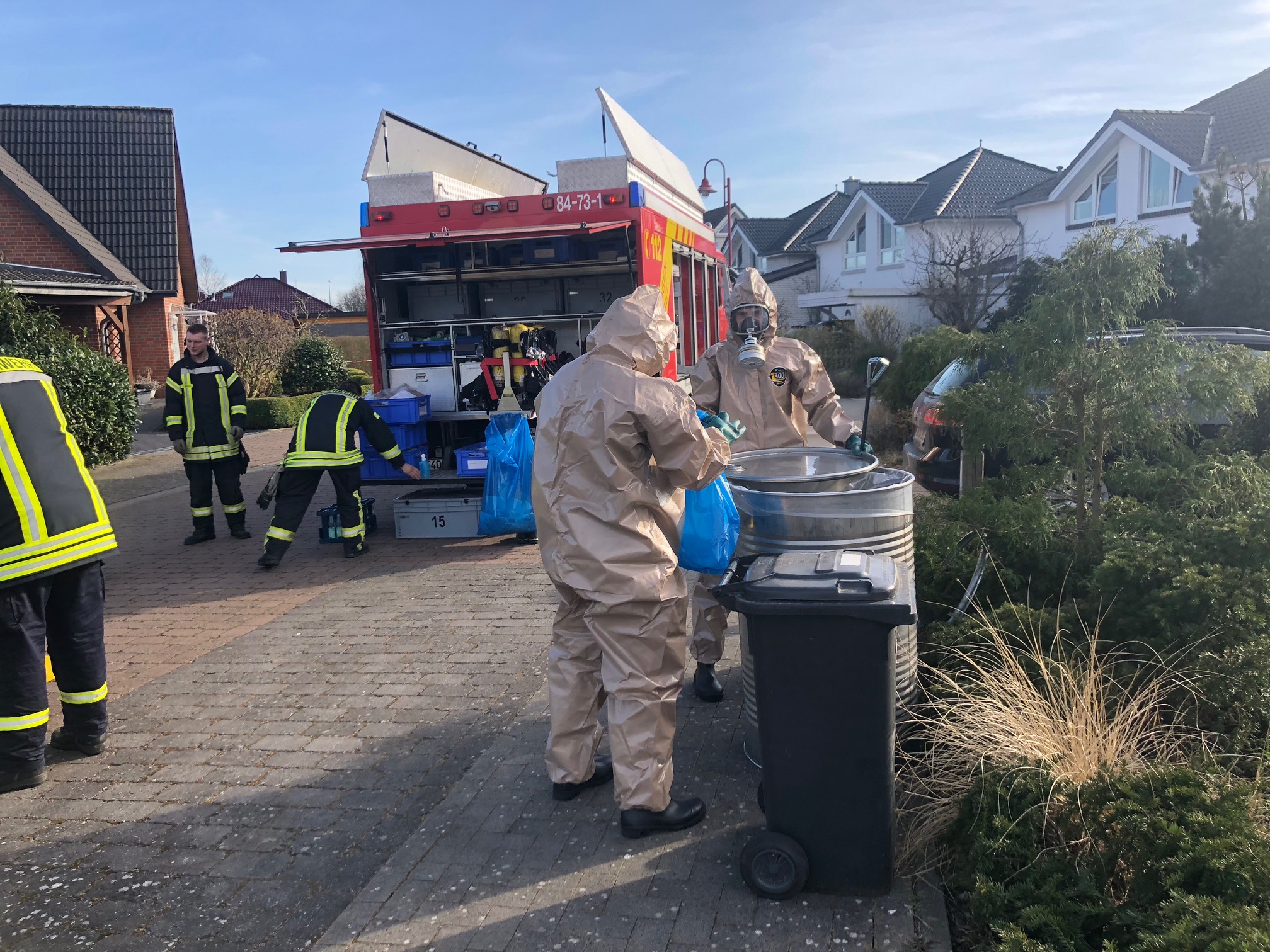 (mt) – Die Ortsfeuerwehr Brinkum und der Einsatzleitwagen aus Fahrenhorst wurden heute gemeinsam mit der Messgruppe Sudweyhe/Barrien und dem Gerätewagen Gefahrgut aus Syke zu einer Amtshilfe für die Polizei alarmiert. In einem Straßenzug in Brinkum wurden in mehreren Briefkästen Briefumschläge mit einer zunächst unbekannten Substanz gefunden. Im Auftrag der Polizei wurden die einzelnen Umschläge von Einsatzkräften in Chemikalienschutzanzügen geborgen und in einem Metallfaß gesichert. Anschließend unterstützen die Einsatzkräfte bei der Probenentnahme für die Stoffbestimmung. Die nachgeforderte Meßgruppe der Kreisfeuerwehr führte weitere Vormessungen durch, die für den Transport der Proben notwendig waren. Da sich der Einsatz über mehrere Stunden vom Nachmittag in den Abend hinzog, unterstütze die Ortsfeuerwehr Brinkum zusammen mit ehrenamtlichen Mitgliedern des DRK bei der Versorgung der Betroffenen und der Einsatzkräfte. Gegen 22:30 wurde von der Einsatzleitung, bestehend aus Polizei und Gesundheitsamt dann Entwarnung gegeben. Die Analyse des Stoffes hatte ergeben, dass es sich u.a. um Zucker und Stärke gehandelt hat. Im Einsatz waren ca. 50 Einsatzkräfte der Ortsfeuerwehren Brinkum und Fahrenhorst, der Kreisfeuerwehr, des Rettungsdienstes und des DRK. Der Landkreis Diepholz war durch den Kreisrat Jens-Hermann Kleine vertreten. Auch Bürgermeister Niels Thomsen war vor Ort und erkundigte sich nach notwendiger Hilfe für die Betroffenen oder anderem Unterstützungsbedarf für die Einsatzkräfte.