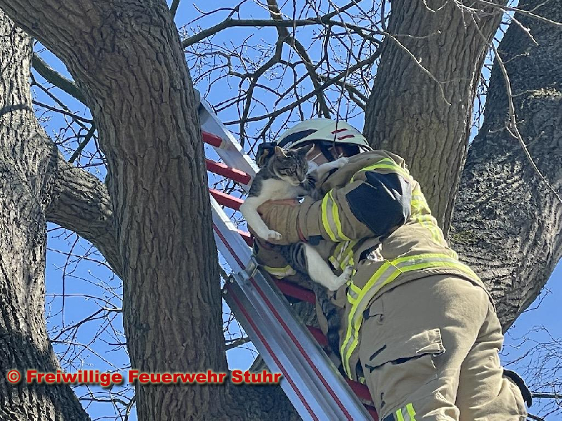 (ct) Am heutigen Samstagmittag um 11:48 Uhr wurde die Feuerwehr Stuhr über Meldeempfänger zu einer Tierrettung alarmiert. Gemeldet wurde eine Katze im Baum. Einsatzort war die Grüne Straße auf Höhe der Einmündung zur An der Lake im Ortsteil Varrel. Hier saß eine junge Katze in einer hohen Eiche. Nachdem sie alleine nicht mehr herunterkam, habe die Besitzer die Feuerwehr gerufen.