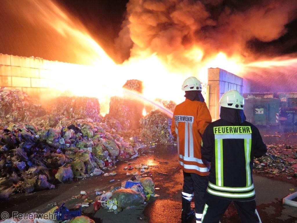 (ct) Zur nachbarschaftlichen Löschhilfe wurde am Freitagabend die Ortsfeuerwehr Fahrenhorst zur Unterstützung der Feuerwehr Nordwohlde um 21:20 Uhr über Sirene und Meldeempfänger zu einem Industriebrand alarmiert. In einem müllverarbeitenden Betrieb im Ortsteil Kätingen der Stadt Bassum waren gepresste Müllballen auf dem Freigelände zwischen zwei Hallen in Brand geraten. Der Feuerschein war schon von weit hin sichtbar. Aus diesem Grund wurde beim Eintreffen die Alarmstufe direkt auf F2 erhöht und somit die Ortsfeuerwehren Bassum, Bramstedt und Dimhausen zur Einsatzstelle gerufen. Vom Einsatzleiter wurden sofort zwei Brandabschnitte für die Brandbekämpfung und ein weiterer für die Wasserversorgung gebildet, um die Ausbreitung auf weitere Bereiche zu verhindern. Die Brandbekämpfung wurde von der Hubarbeitsbühne aus Bassum und über mehrere Wasserwerfer vorgenommen. Zu Spitzenzeiten wurden bis zu 4000 Liter Wasser-Schaumgemisch auf die Brandstelle gefördert. Der massive Löschangriff zeigte schnell erfolgt. Um das Feuer komplett löschen zu können, wurden die Reste der Ballen mit einem Bagger auseinander gefahren und umgeschichtet. Auch die bauliche Abgrenzung der Lagerflächen untereinander durch massive Betonwände trug dazu bei, dass sich das Feuer nicht noch weiter ausbreiten konnte.