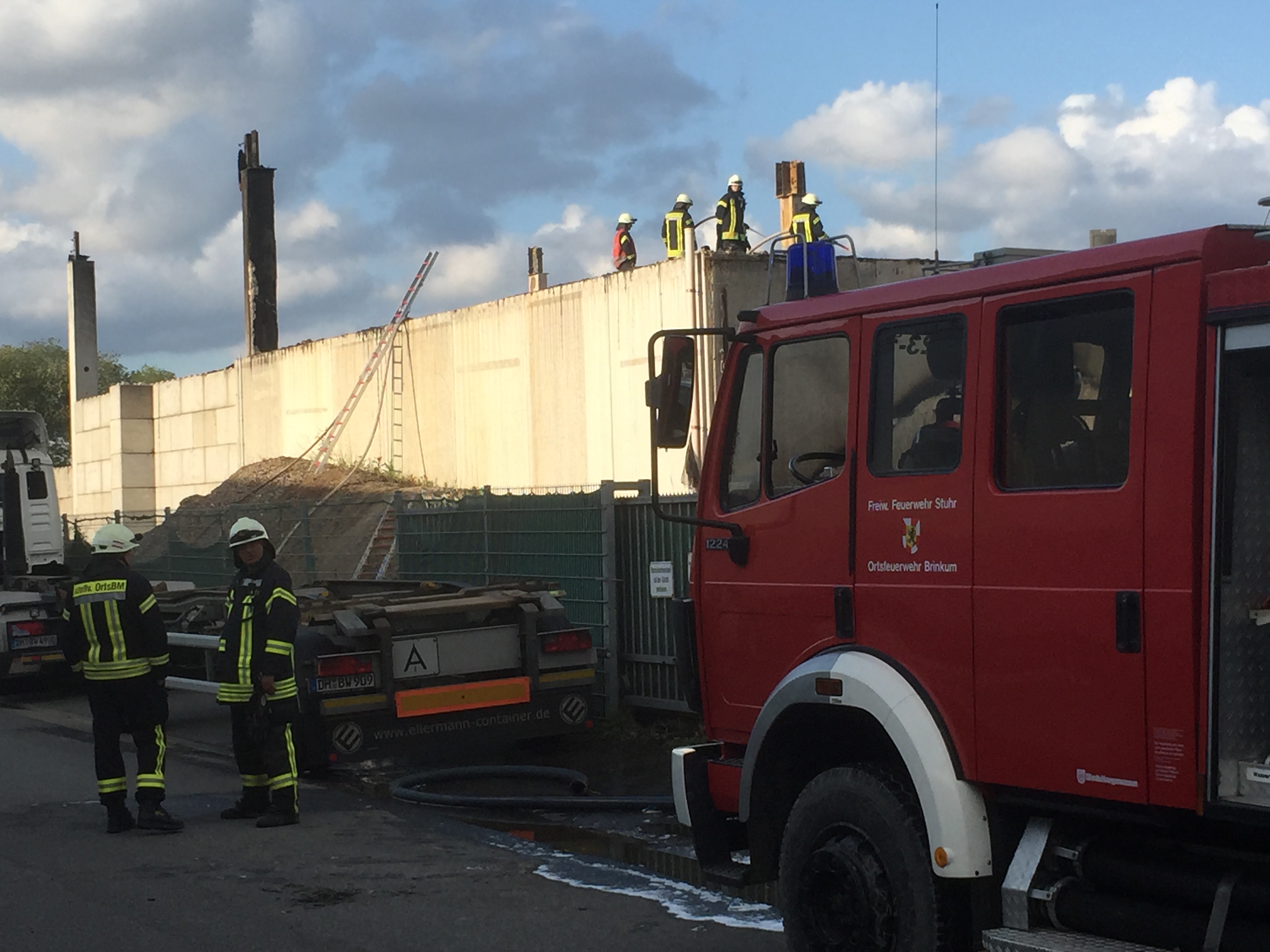 Brinkum (mt) – Auch am heutigen Samstag mussten die Feuerwehren Stuhr und Brinkum erneut in das Gewerbegebiet Rodendamm ausrücken. An insgesamt drei Stellen war ein erneutes Eingreifen der Feuerwehr notwendig. Ein Müllhaufen, der durch geschmolzene Teerdachpappe abgedeckt war musste heute auseinandergezogen und abgelöscht werden, ein Müllhaufen im Aussenbereich hatte ebenfalls wieder zu schwelen begonnen und auch die dicken hölzernen Dachbalken in einer der Hallen fingen wieder an zu brennen. Die Dachkonstruktion wurde daraufhin komplett entfernt, damit die Dachbalken am Boden liegend besser mit Löschwasser durchfeuchtet werden konnten, der Müllhaufen im Aussenbereich wurde mit Löschschaum komplett eingeschäumt.