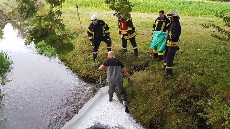 Vor Ort eingetroffen wurden als erste Maßnahmen Ölsperren im Bereich An der Graft und Mühlenweg gesetzt. Da der Zufluss nicht stoppte, wurde die Feuerwehr Gr.Mackenstedt nachalarmiert, um weiter Flußaufwärts im Bereich Birkenweg weitere Ölsperren zusetzen. Somit konnte eine weitere Ausbreitung verhindert und das Öl mittels Bindemittel abgeschöpft werden. Die Ölsperren werden erneut am Folgetag durch die Gemeinde kontrolliert. Die untere Wasserbehörde des Landkreises wurde informiert und die Polizei hat die Ermittlungen zur Ursache aufgenommen.