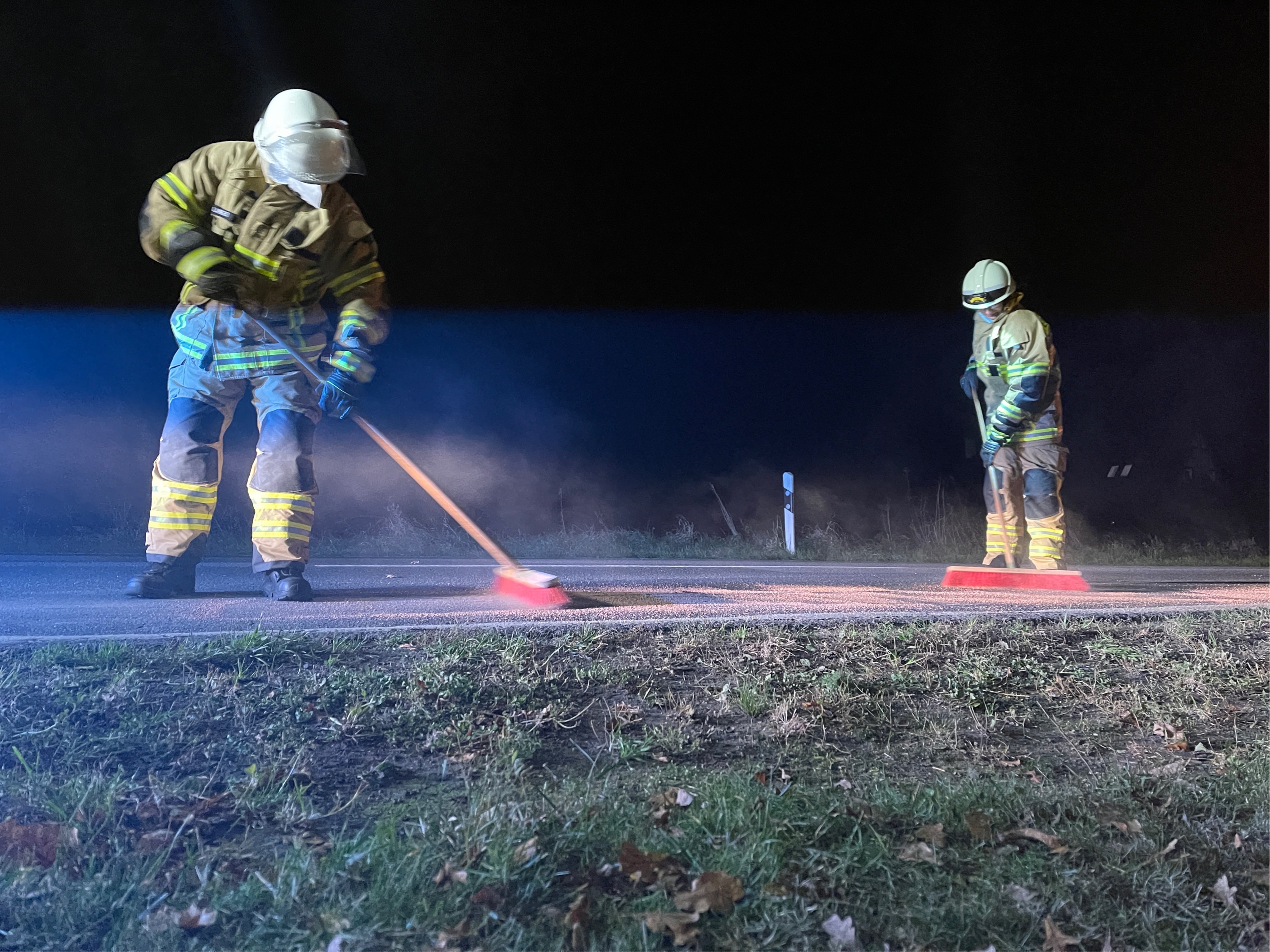 Nach einem Verkehrsunfall, wo bei einem Fahrzeug die Ölwanne beschädigt wurde, war die Fahrbahn sowie der Seitenraum mit Öl verunreinigt. Die betroffenden Stellen wurden mit Bindemittel abgestreut und dieses anschließend aufgenommen. Der Einsatz konnte nach ca. 45 min beendet werden.