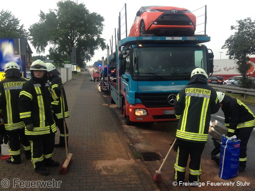 (JG) Gegen 18:25 Uhr wurde die Ortsfeuerwehr Brinkum über Meldeempfänger zu einer technischen Hilfeleistung alarmiert. In Brinkum-Nord platze bei einem LKW ein Hydraulikschlauch und verlor dadurch Hydrauliköl. Die Einsatzkräfte legten Ölsperren mit Bindemittel aus, da das Öl drohte in den Regenabfluss zu laufen. Die Leckage wurde mit Hilfe einer Leckdichtbandage abgedichtet und das bisher ausgetretene Betriebsmittel abgestreut, gebunden und aufgenommen. Während der Arbeiten war der rechte Fahrstreifen gesperrt. Nach ca. anderthalb Stunden war der Einsatz für die Kameraden der Ortsfeuerwehr beendet und konnte an die Polizei übergeben werden.