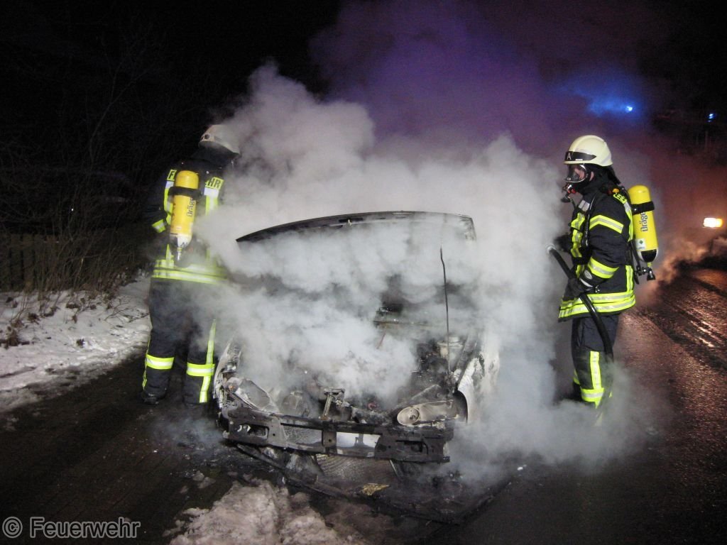 (ct) Am heutigen Morgen um kurz nach 6 Uhr wurde die Ortsfeuerwehr Stuhr über Meldeempfänger zu einem PKW-Brand gerufen. Aus bisher unbekanntem Grund hat ein VW-Golf zu brennen begonnen. Der Fahrer konnte sein Fahrzeug auf der Stuhrer Landstraße auf Höhe der Straße Hinterm Tor stoppen und sich unverletzt retten. Beim Eintreffen des ersten Fahrzeug stand das Auto bereits in Vollbrand. Der Angriffstrupp konnte unter umluftunabhängigem Atemschutz das Feuer schnell mit zwei C-Rohren löschen. Am Fahrzeug entstand Totalschaden. Der Einsatz konnte nach einer dreiviertel Stunde beendet werden.