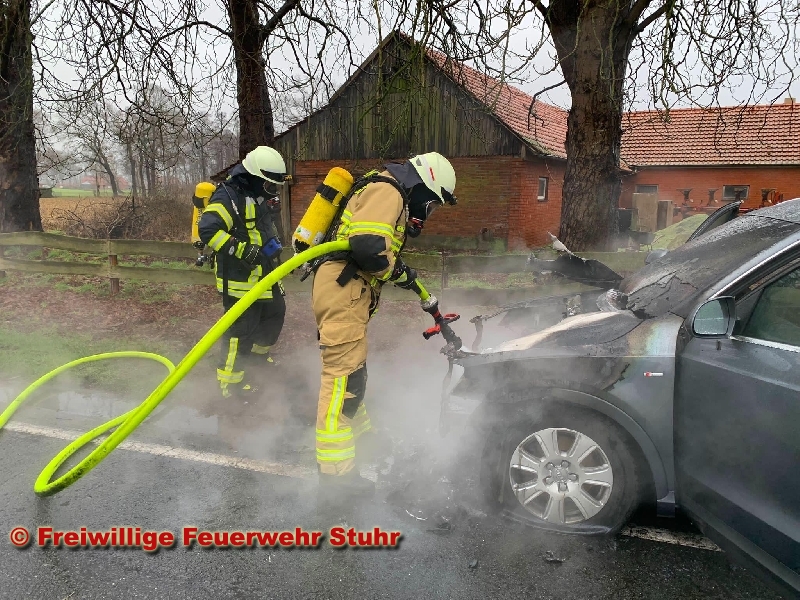 (ct) Heute Vormittag um 11:34 Uhr wurde die Feuerwehr Stuhr über Meldeempfänger alarmiert. Gemeldet wurde ein Pkw-Brand in der Moordeicher Landstraße auf Höhe des Tempelwegs. Beim Eintreffen des ersten Fahrzeugs stand der vordere Bereich des PKW bereits in Vollbrand. Ein erweiterter Angriffstrupp ging unter umluftunabhängigem Atemschutz erst mit der Schnellangriffseinrichtung und dann mit einem C-Rohr zur Brandbekämpfung vor. Das Feuer im Motorraum konnte nach kurzer Zeit gelöscht werden. Da sich das Feuer aber vorher schon bereits so weit ausgedehnt hatte, entstand am Wagen Totalschaden.