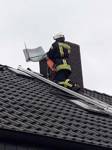 Nachdem das erste Fahrzeug eingetroffen war, wurde eine Schiebeleiter in Stellung gebracht, um die Abdeckung am Schornstein zu erreichen. Die Abdeckung hing nur noch an einer Halterung, die mit Hilfe einer Akkuflex durchtrennt wurde. Die Abdeckung wurde heruntergebracht und so ein unkontrollierter Absturz und die Gefahr von Verletzung ausgeschlossen.
