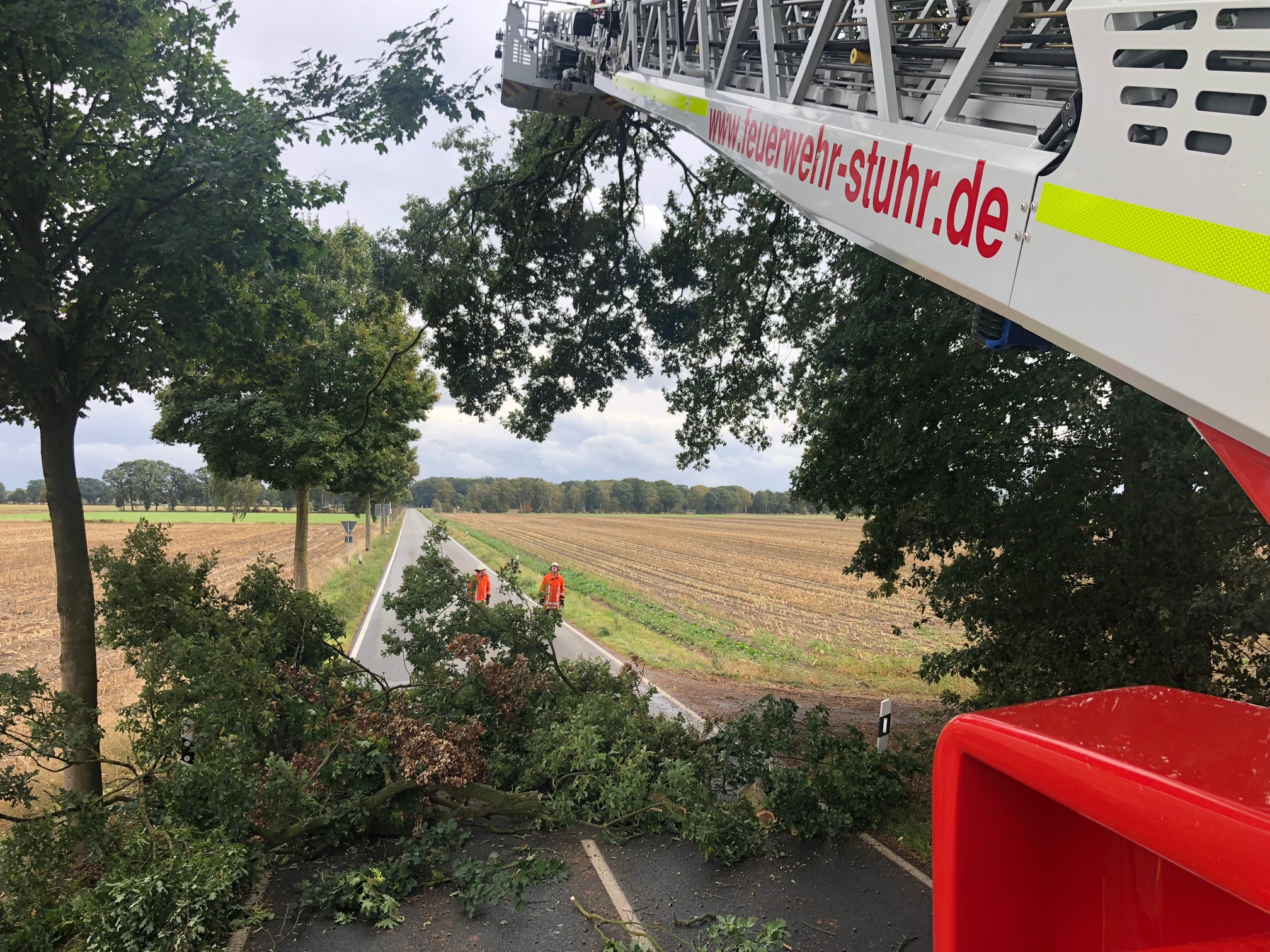 Fahrenhorst-(cm). Um 14:30 wurden die Feuerwehren Fahrenhorst und Brinkum zu einer technischen Hilfeleistung gerufen. In der Ristedter Straße, nahe der Kreuzung Bundesstraße 51, drohten größere Äste aus einem Baum zu fallen. Über den Drehleiterkorb konnten diese mithilfe einer Motorsäge entfernt werden. Die Ristedter Straße musste für die Arbeiten voll gesperrt werden. Nach 75 Minuten war der Einsatz abgearbeitet.
