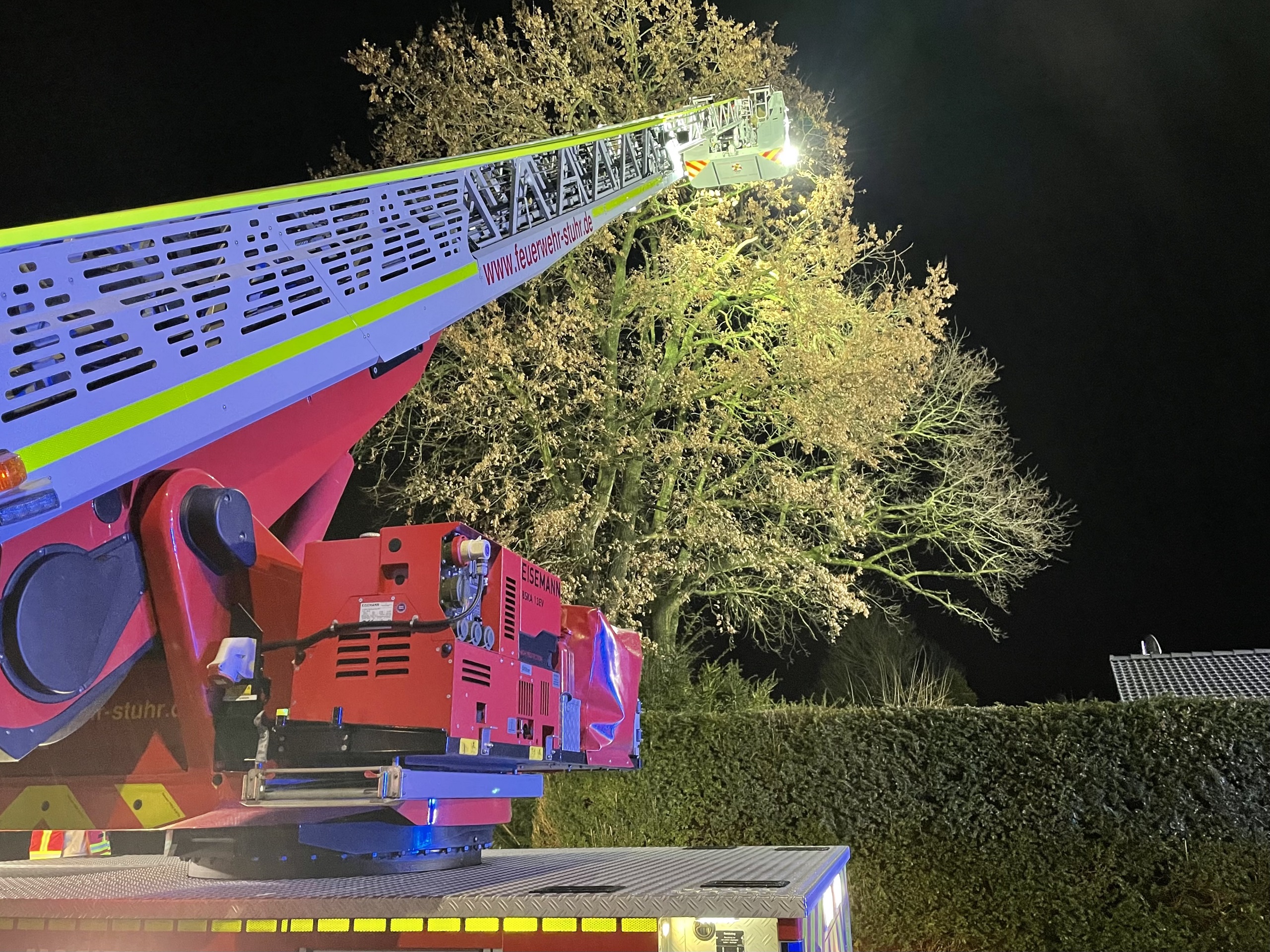 Gr. Mackenstedt – (ps) Die Ortsfeuerwehr Groß Mackenstedt wurde zusammen mit der Drehleiter aus Brinkum zu einer Technischen Hilfeleistung alarmiert. Gemeldet wurde ein ca. 3 Meter langer Ast der sich in einem Baum verfangen hatte und nun drohte auf ein Haus zu stürzen und dieses zu Beschädigen. Durch die Drehleiter wurde der Betroffene Ast und weitere beschädigte Äste beseitig so das keine Gefahr mehr für das Haus besteht.
