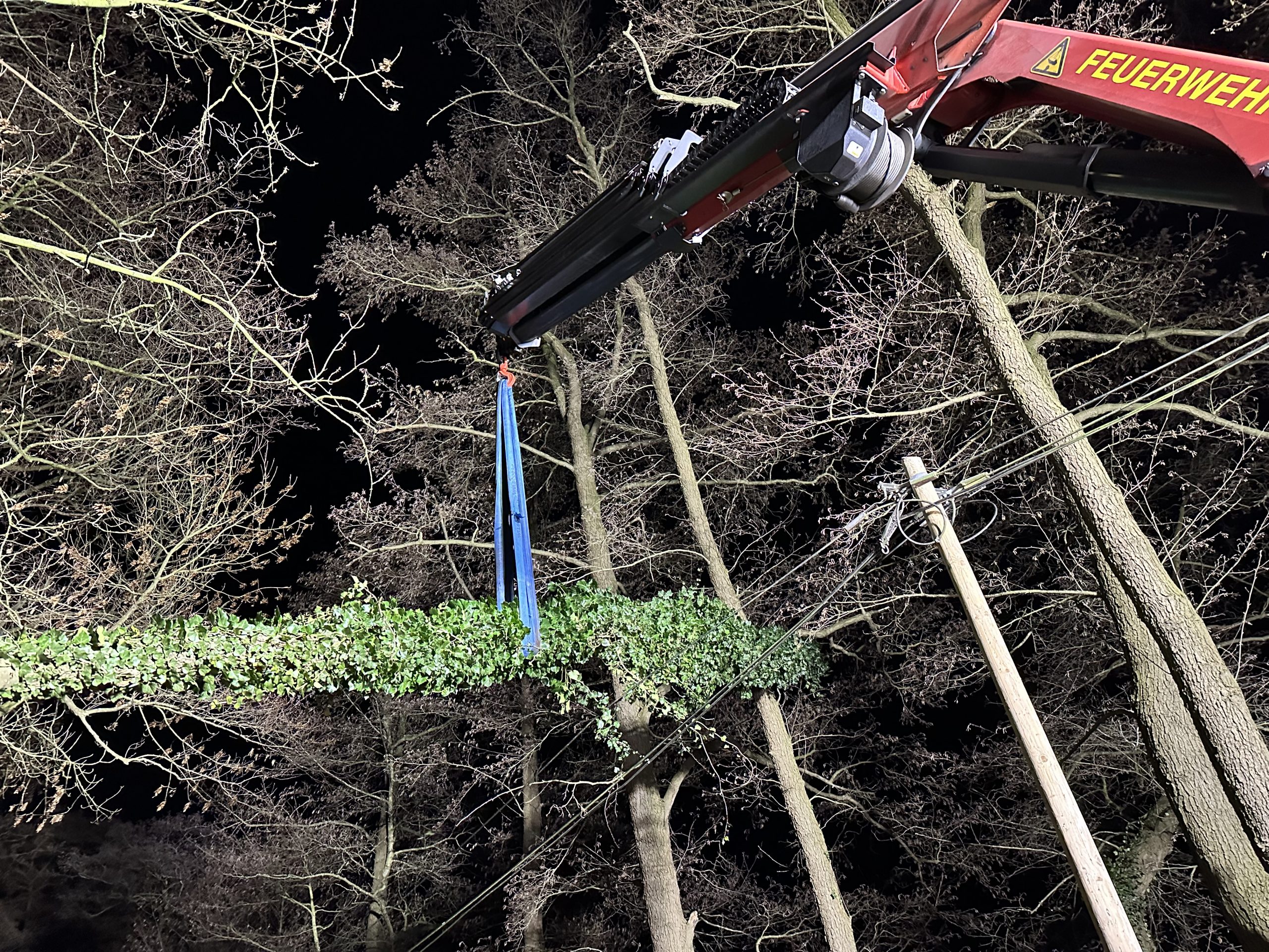 Beim Eintreffen der Feuerwehr bestätigte sich die gemeldete Lage, unter Zuhilfenahme des RW – Kran wurde der Baum von der Telefonleitung gehoben und im seitenraum abgelegt.