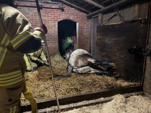 Es handelte sich um ein sehr schweres und sehr großes Pferd. Es war nicht in der Lage, sich selbstständig aus der Zwangslage zu befreien. Zunächst wurde die Einsatzstelle ausgeleuchtet und störende Boxenwände demontiert. Durch das Anlegen von Gurten, konnte das Pferd dann durch die Kraft der Einsatzkräfte, in eine bessere Lage gebracht und anschließend mit Hilfe der Tierärztin wieder aufgerichtet werden.