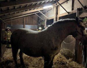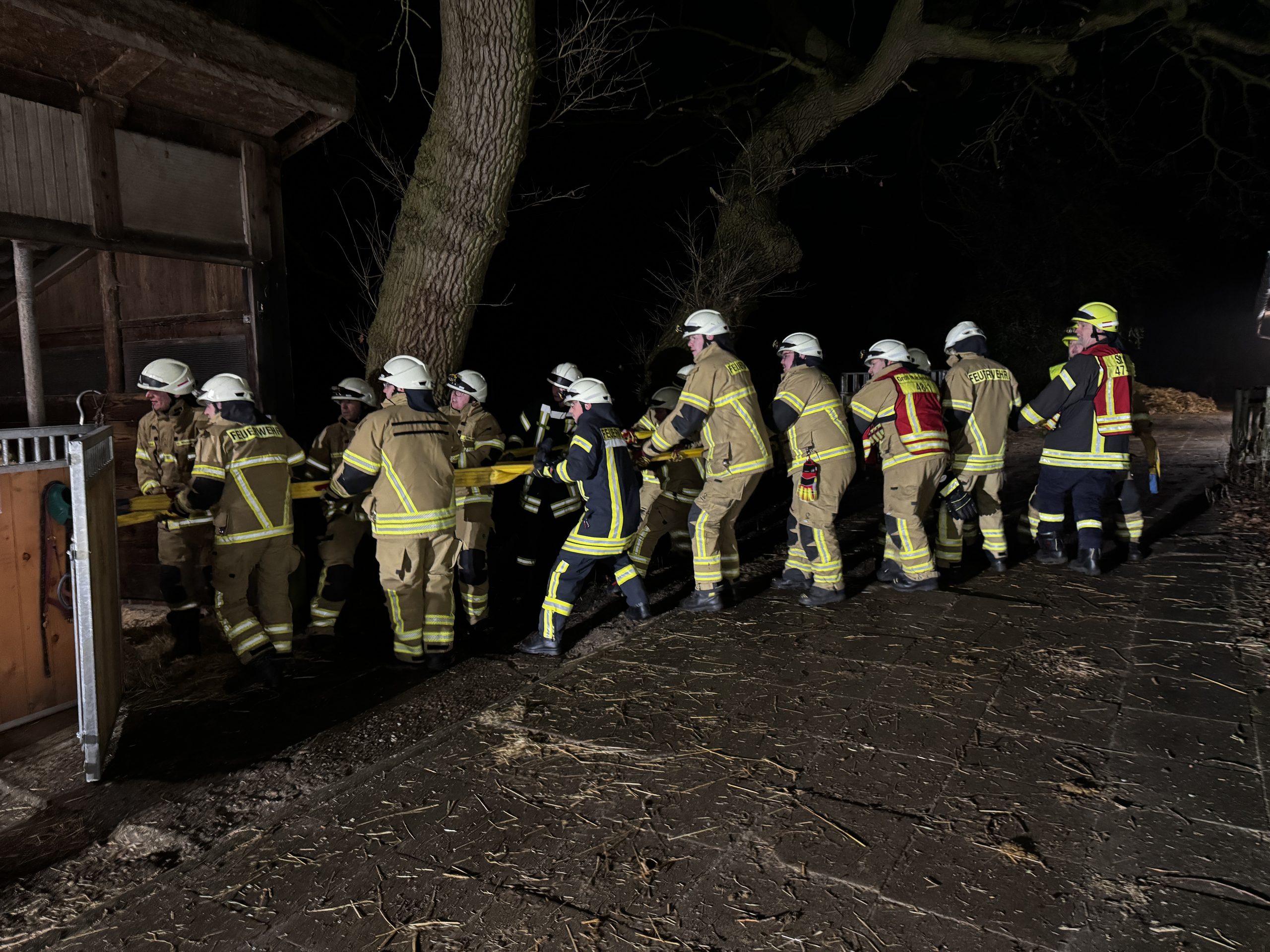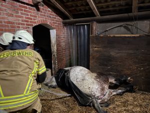 Groß Mackenstedt – (mg). Die Ortsfeuerwehren Gr. Mackenstedt und Stuhr wurden am Dienstagabend um 22.00 Uhr, im Rahmen der Fachgruppe Großtierrettung, zu einem Reiterhof in Groß Mackenstedt alarmiert. Gemeldet war ein festliegendes Pferd in seiner Box. Nach erster Lageerkundung wurde das Pferd auf der Seite liegend aufgefunden.
