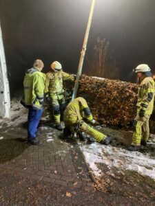 Bei Eintreffen wurde festgestellt, dass die Laterne in Schieflage in einer Hecke hing. Der ebenfalls vor Ort befindende Notdienst des Netzbetreibers stellte die Stromversorgung der Laterne ab, damit die Feuerwehr die Laterne sicher bergen und im Seitenbereich ablegen konnte.