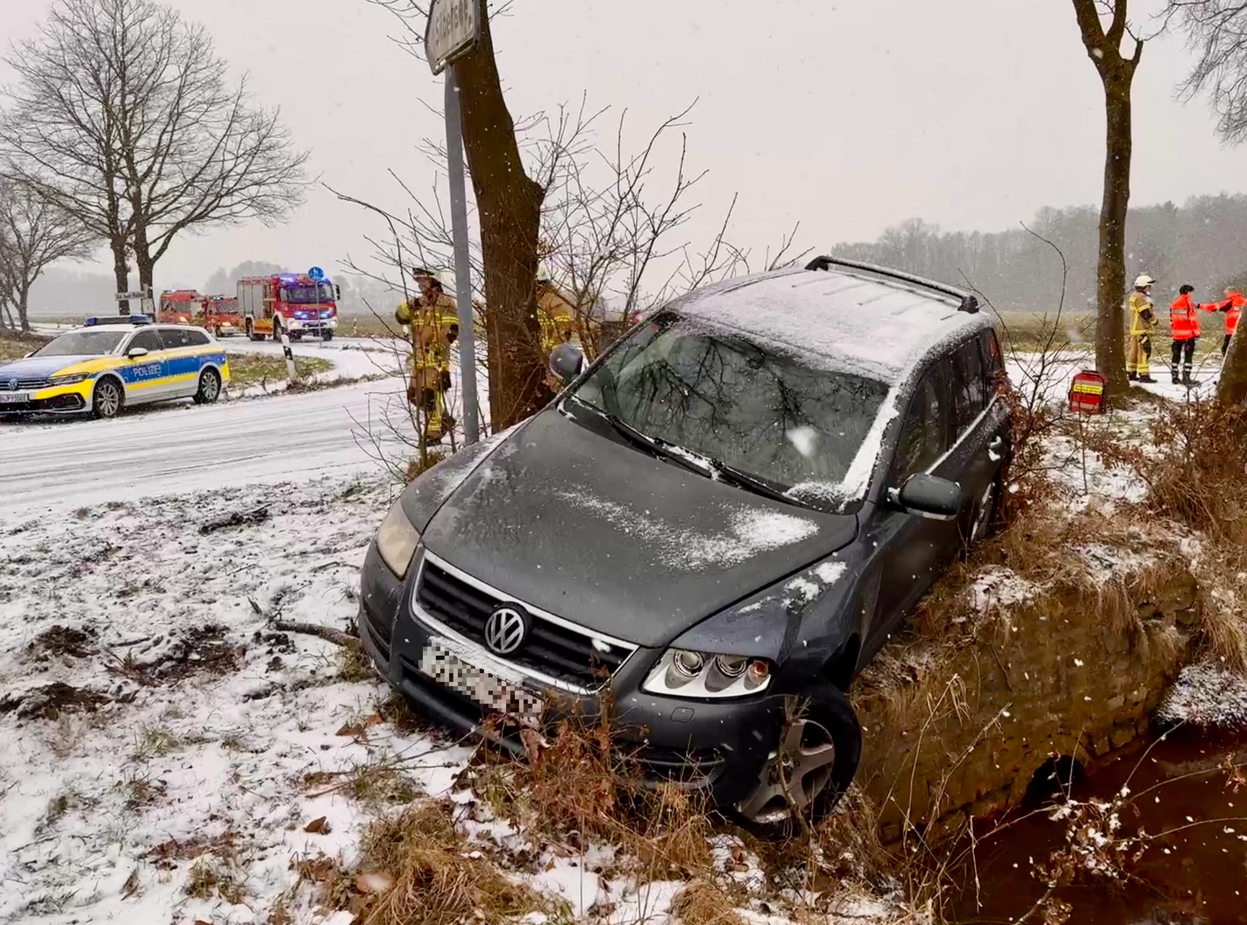 Brinkum-(cm). Am Mittwochmorgen um 08:58 Uhr wurden die Feuerwehr Brinkum und der Rettungsdienst zu einem Verkehrsunfall nach Brinkum gerufen. Ein Pkw war im Kurvenbereich „An den Roden“ Ecke „Brunnenweg“ von der Straße abgekommen und drohte, in einen wasserführenden Graben zu rutschen. Laut ersten Meldungen sollten die Fahrerin und ein Kind im Fahrzeug eingeschlossen sein. Bei Eintreffen der Einsatzkräfte hatten jedoch beide Personen das Fahrzeug bereits verlassen können. Ein Rettungssanitäter der Feuerwehr kümmerte sich um die leichtverletzten Insassen, bis zum Eintreffen des Rettungsdienstes. Nach etwa 30 Minuten war der Einsatz für die Feuerwehr abgeschlossen.