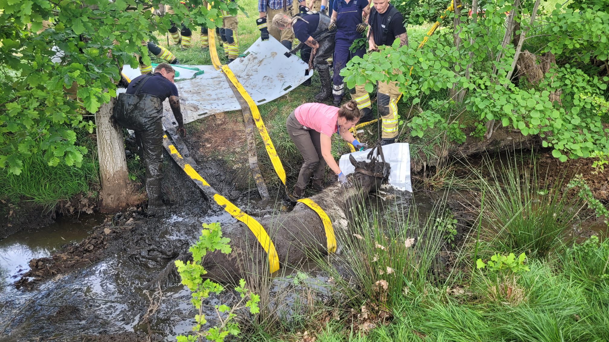 Eine Tinkerstute lag vermutlich schon seit einigen Stunden in einem schlammigen Wassergraben fest, bevor sie durch ihre Besitzer aufgefunden wurde. Die alarmierte BF Bremen stellte vor Ort fest, dass das Tier nicht mit normalen Mitteln gerettet werden konnte. Daher wurde die auf Einsätze zur Rettung großer Tiere spezialisierte Fachgruppe Großtierrettung der Gemeinde Stuhr alarmiert. Mit Kommandowagen und Anhänger, Rüstwagen-Kran aus Groß Mackenstedt sowie einem Löschlöschgruppenfahrzeug 20 aus Stuhr, wurde im Zugverband nach Bremen ausgerückt.