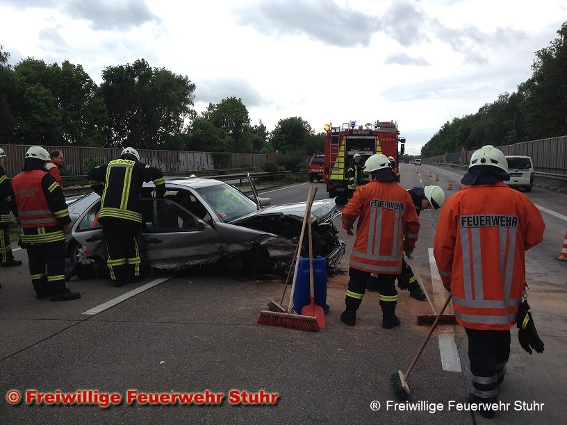 (JG) Gegen 17:15 Uhr wurde die Ortsfeuerwehr Brinkum über Meldeempfänger zu einen Verkehrsunfall auf der BAB 1 – Fahrtrichtung Osnabrück zwischen der AS Brinkum und dem AD Stuhr alarmiert. Aus bislang ungeklärter Ursache verunfallte ein Fahrzeug, wobei eine Person schwer verletzt wurde, welche beim Eintreffen der ersten Einsatzkräfte schon vom Rettungsdienst und vom Notarzt versorgt wurde. Zusammen mit den Einsatzkräften der Feuerwehr traf auch der Leitende Notarzt ein, welcher die Versorgung und den Abtransport mit dem Rettungsdienst koordinierte. Da der nachfolgende Verkehr bereits komplett zum Stillstand gekommen war, sperrte die Feuerwehr die Autobahn vorübergehend voll, nahm auslaufende Betriebsstoffe mit Bindemittel auf und stellte den Brandschutz sicher. Im Verlauf der Arbeiten konnte eine Fahrspur wieder freigegeben werden. Die Feuerwehr stellte bis zum Abtransport des verunfallten KFZ den Brandschutz sicher und konnte nach anderthalb Stunden wieder zum Feuerwehrhaus und den Einsatz beenden.